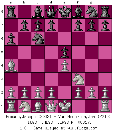 Last move : 1-0 2017 January 1 13:45:25 [Event "FICGS__CHESS__CLASS_A__000175"] [Site "FICGS"] [Date "2016.12.29"] [Round "1"] [White "Romano,Jacopo"] [Black "Van Mechelen,Jan"] [Result "1-0"] [WhiteElo "2032"] [BlackElo "2210"] 1.e4 e5 2.Nf3 Nc6 3.Bb5 a6 4.Ba4 1-0 Ruy Lopez Player White won this chess game. Follow this game move after move (download)Chess is a fairy tale of 1001 blunders. (Savielly Tartakower) Wenn Du einsam bist, wenn Du Dich in der Welt wie ein Fremder fühlst, spiele Schach. Das wird Deinen Geist erheben und Dein Ratgeber im Kampf sein. (Aristoteles) El Ajedrez es tan interesante por sí solo, que no es necesario un interés monetario para persuadir a una persona a que lo practique; por lo tanto, nunca se juega por dinero. (Benjamin Franklin) La conception d'un plan est le processus par lequel un joueur exploite les avantages de sa position tout en s'efforçant d'en réduire au minimum les inconvénients. Afin de garantir le succès, un plan doit toujours se fonder sur un diagnostic objectif des particularités d'une position. La conception d'un plan est d'autant plus difficile que la position est équilibrée, et grandement facilitée lorsqu'il n'existe qu'un seul plan susceptible de répondre aux exigences de la position. (Harry Golombek) Computers make it easier to do a lot of things, but most of the things they make it easier to do don't need to be done. (Andy Rooney)