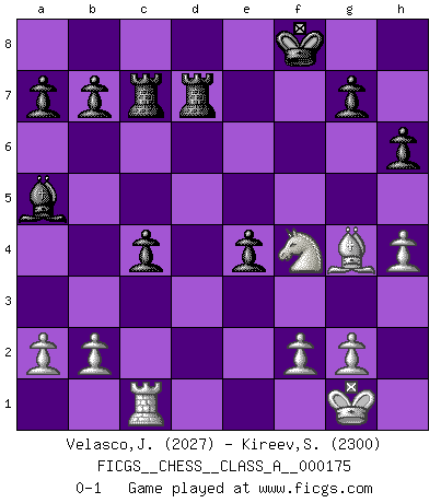 Last move : 0-1 2017 June 20 21:51:37 [Event "FICGS__CHESS__CLASS_A__000175"] [Site "FICGS"] [Date "2016.12.29"] [Round "1"] [White "Velasco,Jose Maria"] [Black "Kireev,Sergey"] [Result "0-1"] [WhiteElo "2027"] [BlackElo "2300"] 1.d4 d5 2.c4 c6 3.Nf3 Nf6 4.Nc3 e6 5.Bg5 h6 6.Bxf6 Qxf6 7.e3 Nd7 8.Be2 Bd6 9.O-O Qe7 10.e4 dxe4 11.Nxe4 Bc7 12.Re1 O-O 13.Bd3 Rd8 14.Qe2 c5 15.d5 exd5 16.cxd5 Ne5 17.Nxe5 Qxe5 18.d6 Ba5 19.Red1 Bf5 20.h3 Bg6 21.Rac1 Rac8 22.Ng3 Qxe2 23.Bxe2 Rc6 24.d7 Rc7 25.Bg4 Kf8 26.h4 c4 27.Ne2 Be4 28.Rd4 f5 29.Nf4 R8xd7 30.Rxe4 fxe4 0-1 This chess game has been lost on time (started : 2016.12.29 22:13:40) QGD Slav : 4.Nc3 Kingside Castling by player White (move 9) Kingside Castling by player Black (move 12) Player Black won this chess game. Follow this game move after move (download)I prefer to lose a really good game than to win a bad one. (David Levy) Taktik ist was man tun muß, wenn etwas zu tun ist. Strategie ist was man tun muß, wenn nichts zu tun ist. (Savielly Grigorievitsch Tartakower) Del Ajedrez se ha dicho que la vida no es lo suficientemente larga para él, pero eso es culpa de la vida, no del Ajedrez. (William Ewart Napier) Il a essayé de se convaincre qu'il pourrait empêcher toutes les erreurs et ne jamais perdre. L'horreur ! Gary Kasparov au sujet de Robert Fischer. He who fights with monsters should be careful lest he thereby become a monster. (Friedrich Nietzsche, Beyond Good and Evil)