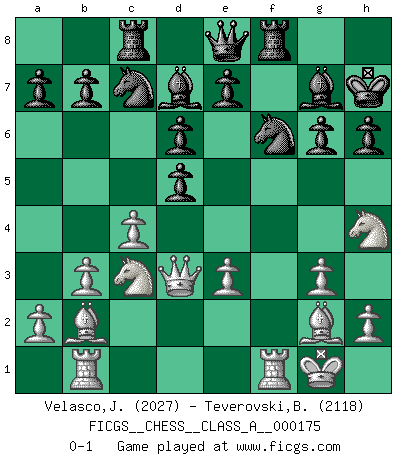 Last move : 0-1 2017 May 31 19:27:2 [Event "FICGS__CHESS__CLASS_A__000175"] [Site "FICGS"] [Date "2016.12.29"] [Round "1"] [White "Velasco,Jose Maria"] [Black "Teverovski,Bogoljub"] [Result "0-1"] [WhiteElo "2027"] [BlackElo "2118"] 1.d4 f5 2.g3 Nf6 3.Bg2 d6 4.Nf3 g6 5.O-O Bg7 6.b3 O-O 7.Bb2 Qe8 8.c4 Na6 9.Nc3 c6 10.d5 Bd7 11.Rb1 Rc8 12.e4 fxe4 13.Ng5 e3 14.fxe3 h6 15.Nf3 Nc7 16.Nh4 Kh7 17.Qd3 cxd5 0-1 This chess game has been lost on time (started : 2016.12.29 22:13:40) Dutch defense Kingside Castling by player White (move 5) Kingside Castling by player Black (move 6) Player Black won this chess game. Follow this game move after move (download)Only the player with the initiative has the right to attack. (Wilhelm Steinitz) Es ist im Leben wie im Schachspiel. Wir entwerfen einen Plan, dieser bleibt jedoch bedingt durch das, was im Schachspiel dem Gegner, im Leben dem Schicksal zu tun belieben wird. (Arthur Schopenhauer) Con el tiempo, empecé a progresar en partidas decisivas. Tal vez porque me di cuenta de una simple verdad: no solo estaba yo nervioso sino también mi oponente. (Mikhail Tal) Lorsque vous vous retrouvez devant une position atroce, ne tendez pas un ultime piège dérisoire avec l'intention d'abandonner si l'adversaire le déjoue ! Faites-vous plutôt un devoir de résister comme si votre vie en dépendait. Jouez le coup qui vous déplairait au centuple si vous étiez dans la peau de votre tortionnaire ! Wipe them out. All of them. (Darth Sidious in Star Wars ep.1)