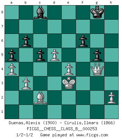 Last move : 1/2-1/2 2017 February 28 20:15:42 [Event "FICGS__CHESS__CLASS_B__000253"] [Site "FICGS"] [Date "2016.12.31"] [Round "1"] [White "Duenas,Alexis"] [Black "Cirulis,Ilmars"] [Result "1/2-1/2"] [WhiteElo "1900"] [BlackElo "1866"] 1.d4 e6 2.c4 Nf6 3.g3 Bb4+ 4.Bd2 Be7 5.Bg2 d5 6.Qc2 Nbd7 7.Nf3 O-O 8.O-O c6 9.Bf4 b6 10.Rd1 Bb7 11.Nc3 dxc4 12.Nd2 Nd5 13.Nxc4 Nxf4 14.gxf4 Rc8 15.Rac1 Qc7 16.e3 Rfd8 17.a3 Nf8 18.f5 c5 19.d5 Ba6 20.Nd2 exf5 21.Qxf5 Ng6 22.Be4 Rd6 23.a4 Rf6 24.Qh3 Nf8 25.Bf5 Rh6 26.Qg3 Bd6 27.f4 Rd8 28.Nde4 Ng6 29.Nxd6 Qxd6 30.Bc2 Bb7 31.Rd2 Bc8 32.Ne4 Qf8 33.Ng5 f6 34.f5 fxg5 35.fxg6 hxg6 36.Rf1 Qe8 37.Qxg5 Rh5 38.Qf4 Ba6 39.Rfd1 Re5 40.e4 Rd6 41.Qg3 Qe7 42.Kh1 Bc8 43.Rf2 Rg5 44.Qb3 Rh5 45.Rg1 Rh3 46.Rg3 Qh4 47.Kg1 Rf6 48.Qe3 a5 49.b3 Qh5 50.Rxf6 Rxg3+ 51.Qxg3 gxf6 52.Kf2 g5 53.Ke3 Qg4 54.Qxg4 1/2-1/2 Queen's pawn Kingside Castling by player Black (move 7) Kingside Castling by player White (move 8) This chess game ended in a draw. Follow this game move after move (download)All I want to do, ever, is just play Chess. (Bobby Fischer) Weshalb minderdergeübte Spieler mit g2-g4 beginnen? Die betreffenden sind unschlüssig, ob sie nun rechts (h4) oder links (f4) beginnen sollen, und in ihrer Ratlosigkeit entschliessen sie sich nach guter Bürgerart dazu, den goldenen Mittelweg zu wählen. (Aaron Nimzowitsch) La vida es como un juego de Ajedrez, cambiando con cada movimiento. (Proverbio Chino) Aidez vos pièces, elles vous aideront. (Paul Morphy) A good programmer is someone who always looks both ways before crossing a one-way street. (Doug Linder)