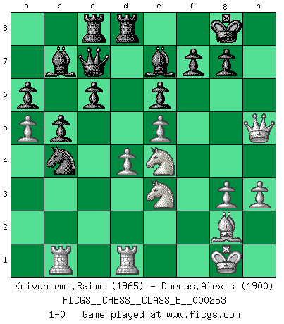 Last move : 1-0 2017 January 30 13:6:39 [Event "FICGS__CHESS__CLASS_B__000253"] [Site "FICGS"] [Date "2016.12.31"] [Round "1"] [White "Koivuniemi,Raimo"] [Black "Duenas,Alexis"] [Result "1-0"] [WhiteElo "1965"] [BlackElo "1900"] 1.d4 Nf6 2.c4 e6 3.g3 d5 4.Bg2 Be7 5.Nf3 O-O 6.O-O dxc4 7.Qc2 a6 8.a4 Bd7 9.Qxc4 Bc6 10.Bg5 Bd5 11.Qc2 Be4 12.Qc1 Nbd7 13.Nc3 Bc6 14.Qc2 h6 15.Bxf6 Nxf6 16.e4 b6 17.Rfd1 Bb7 18.Ne5 Rc8 19.Nc4 Qd7 20.Ne3 Bb4 21.Na2 Be7 22.b4 Rfd8 23.Rab1 b5 24.a5 h5 25.h3 h4 26.Nc3 hxg3 27.fxg3 c6 28.Qe2 Qc7 29.e5 Nd5 30.Ne4 Nxb4 31.Qh5 1-0 Catalan : Closed, 5.Nf3 Kingside Castling by player Black (move 5) Kingside Castling by player White (move 6) Player White won this chess game. Follow this game move after move (download)Chess is a terrible game. If you have no center, your opponent has a freer position. If you do have a center, then you really have something to worry about ! (Siegbert Tarrasch) Die größte Kunst beim Schach besteht darin dem Gegner nicht zu zeigen was er tun kann. (Garry Kasparov) Una clavada es mas poderosa que una espada. (Fred Reinfeld) Tout change constamment, y compris dans le monde des Echecs. (Botvinnik) Philosophers use a language that is already deformed as though by shoes that are too tight. (Ludwig Wittgenstein)