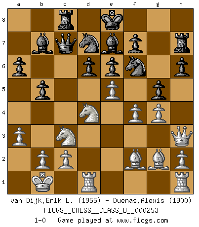 Last move : 1-0 2017 February 23 12:16:3 [Event "FICGS__CHESS__CLASS_B__000253"] [Site "FICGS"] [Date "2016.12.31"] [Round "1"] [White "van Dijk,Erik L."] [Black "Duenas,Alexis"] [Result "1-0"] [WhiteElo "1955"] [BlackElo "1900"] 1.e4 c5 2.Nf3 d6 3.d4 cxd4 4.Nxd4 Nf6 5.Nc3 a6 6.Bg5 e6 7.f4 h6 8.Bh4 Qb6 9.a3 Be7 10.Bf2 Qc7 11.Qf3 Nbd7 12.O-O-O b5 13.g4 Bb7 14.Bg2 Rc8 15.Kb1 g5 16.Qh3 Rh7 17.e5 1-0 Sicilian : Najdorf, 7.f4 Queenside Castling by player White (move 12) Player White won this chess game. Follow this game move after move (download)A man that will take back a move at Chess will pick a pocket. (Richard Fenton) Darum geht es im Schach. Einen Tag gibst du deinem Gegner eine Lektion, am nächsten Tag gibt er dir eine. (Robert James Fischer) Un Peón pasado es un criminal, quién debe ser mantenido bajo candado y llave. Leves medidas, tales como vigilancia policiaca, no son suficientes. (Aaron Nimzovich) Le moment que je préfère le plus dans une rencontre, c'est celui où je sens que la personnalité de l'adversaire se brise. (Robert Fischer) Coffee just isn't my cup of tea. (Unknown)