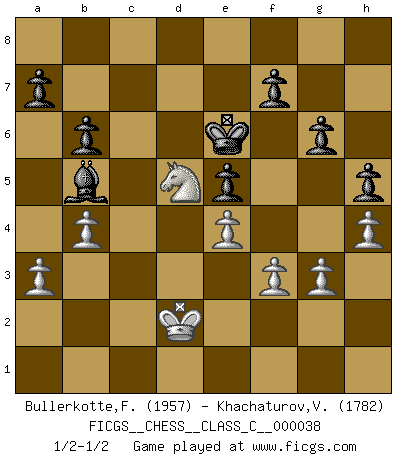 Last move : 1/2-1/2 2007 May 17 15:39:1 [Event "FICGS__CHESS__CLASS_C__000038"] [Site "FICGS"] [Date "2007.04.03"] [Round "1"] [White "Bullerkotte,Frank"] [Black "Khachaturov,Vadim"] [Result "1/2-1/2"] [WhiteElo "1957"] [BlackElo "1782"] 1.d4 Nf6 2.c4 e6 3.Nc3 Bb4 4.Qc2 O-O 5.a3 Bxc3+ 6.Qxc3 b6 7.Bg5 Bb7 8.f3 h6 9.Bh4 d5 10.e3 Nbd7 11.cxd5 Nxd5 12.Bxd8 Nxc3 13.Bh4 Nd5 14.Bf2 c5 15.e4 Nf4 16.Be3 Ng6 17.O-O-O cxd4 18.Rxd4 Nc5 19.Kb1 e5 20.Rd1 Rfd8 21.Rxd8+ Rxd8 22.Ne2 Nb3 23.Nc3 Kf8 24.Bc4 Nd2+ 25.Bxd2 Rxd2 26.Rd1 Rxd1+ 27.Nxd1 Bc6 28.Ne3 Bd7 29.g3 Ne7 30.b4 Nc6 31.Bb5 Ke7 32.Bxc6 Bxc6 33.Kc2 h5 34.h4 Ke6 35.Kd3 Bb5+ 36.Kd2 g6 37.Nd5 Bc4 38.Ne3 Bb5 39.Nd5 1/2-1/2 Nimzo-Indian : Classical variation Kingside Castling by player Black (move 4) Queenside Castling by player White (move 17) This chess game ended in a draw. Follow this game move after move (download)One doesn't have to play well, it's enough to play better than your opponent. (Siegbert Tarrasch) Ein Gewinn durch eine ungenaue Kombination, sei sie auch noch so vorzeigbar, erfüllt mich mit Schaudern. (Wilhelm Steinitz) Observen a Garry Kasparov. Después de una derrota, invariablemente el gana la próxima partida. Prácticamente hace pedazos a su siguiente oponente. Eso es algo que tenemos que aprender a lograr. (Maurice Ashley) Votre seul travail dans les ouvertures est d'obtenir un milieu de partie jouable. (Lajos Portish) A good aphorism is too hard for the tooth of time, and is not worn away with the centuries, although it serves as food for every speech. (Friedrich Nietzsche)
