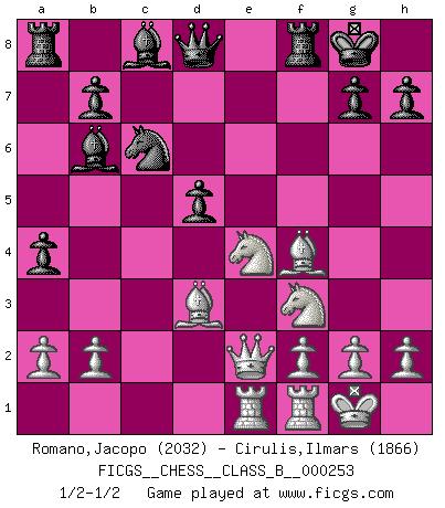 Last move : 1/2-1/2 2017 March 26 22:43:45 [Event "FICGS__CHESS__CLASS_B__000253"] [Site "FICGS"] [Date "2016.12.31"] [Round "1"] [White "Romano,Jacopo"] [Black "Cirulis,Ilmars"] [Result "1/2-1/2"] [WhiteElo "2032"] [BlackElo "1866"] 1.e4 e6 2.d4 d5 3.Nd2 Be7 4.Bd3 c5 5.dxc5 Nf6 6.Qe2 Bxc5 7.Ngf3 O-O 8.O-O Nc6 9.e5 Nd7 10.Nb3 Bb6 11.c4 f6 12.exf6 Nxf6 13.Bf4 a5 14.Rae1 a4 15.Nbd2 Ne4 16.cxd5 exd5 17.Nxe4 1/2-1/2 French : Tarrasch Kingside Castling by player Black (move 7) Kingside Castling by player White (move 8) This chess game ended in a draw. Follow this game move after move (download)You must take your opponent into a deep dark forest where 2+2=5, and the path leading out is only wide enough for one. (Mikhail Tal) Das Schach hält seine Meister in eigenen Banden, Fesseln; auf vielerlei Weise formt es ihren Geist, so dass die innere Freiheit selbst des Stärksten beeinflusst wird. (Albert Einstein) La caracteristica mas importante en la posición del Ajedrez es la actividad de las piezas. Esto es absolutamente fundamental en todas las fases del juego: Apertura, Juego Medio y especialmente Finales. La limitación primordial en la actividad de una pieza, es la estructuración de los Peones. (Michael Stean) Le pion, dans sa simplicité, marche droit devant lui, mais lorsqu'il prend, il le fait obliquement? Ainsi l'homme, tant qu'il reste pauvre, marche dans la droiture et vit honnêtement, mais lorsqu'il recherche les honneurs, il flatte, se parjure et, par les voies obliques, cherche une position supérieure sur l'échiquier du monde. (Jean de Galles) That's absurd. I love it. (Gregory House, House M.D.)
