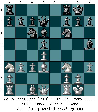 Last move : 0-1 2017 March 20 17:4:52 [Event "FICGS__CHESS__CLASS_B__000253"] [Site "FICGS"] [Date "2016.12.31"] [Round "1"] [White "de la Foret,Fred"] [Black "Cirulis,Ilmars"] [Result "0-1"] [WhiteElo "1900"] [BlackElo "1866"] 1.e4 e6 2.d4 d5 3.exd5 exd5 4.Nf3 Nf6 5.Bd3 Bd6 6.O-O O-O 7.b3 Bg4 8.h3 Bh5 9.Na3 Nc6 10.c3 Qd7 0-1 French : Exchange variation Kingside Castling by player White (move 6) Kingside Castling by player Black (move 6) Player Black won this chess game. Follow this game move after move (download)Nowadays, when you're not a grandmaster at 14, you can forget about it. (Anand Viswanathan) Es war undenkbar für die Behörden, dass ein sowjetischer Großmeister auf diese Art und Weise [Fischer-Taimanov 6:0] verliert, ohne dass es eine politischer Erklärung dafür gäbe. (Mark Taimanov) Yo siempre he tenido un ligero sentimiento de lástima por una persona que no tiene conocimiento del Ajedrez. (Siegbert Tarrasch) Même un GMI sait rarement calculer sur plus de cinq coups une attaque à sacrifices. (Rudolf Spielmann) Luck is when opportunity knocks and you answer. (Anonymous)