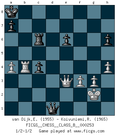 Last move : 1/2-1/2 2017 August 1 15:46:7 [Event "FICGS__CHESS__CLASS_B__000253"] [Site "FICGS"] [Date "2016.12.31"] [Round "1"] [White "van Dijk,Erik L."] [Black "Koivuniemi,Raimo"] [Result "1/2-1/2"] [WhiteElo "1955"] [BlackElo "1965"] 1.d4 Nf6 2.c4 e6 3.g3 d5 4.Bg2 dxc4 5.Nf3 c6 6.Ne5 Bb4+ 7.Bd2 Qxd4 8.Bxb4 Qxe5 9.Na3 b5 10.Bd6 Qxb2 11.O-O Nd5 12.Nc2 Bb7 13.e4 Nc3 14.Qd2 c5 15.Qg5 Nc6 16.e5 Ne2+ 17.Kh1 h6 18.Qxg7 O-O-O 19.Qxf7 Rd7 20.Qg6 Ncd4 21.Nxd4 Nxd4 22.Bxc5 Nf3 23.Bd6 Ng5 24.Bxb7+ Kxb7 25.f3 Kb6 26.Qf6 Rc8 27.Qf4 Kb7 28.Qe3 Qc2 29.a4 b4 30.h4 Nf7 31.Rab1 Nxd6 32.Rxb4+ Ka8 33.exd6 Rxd6 34.Rc1 Rd1+ 35.Rxd1 Qxd1+ 36.Kg2 Rc6 1/2-1/2 Catalan : Open, 5.Nf3 Kingside Castling by player White (move 11) Queenside Castling by player Black (move 18) This chess game ended in a draw. Follow this game move after move (download)Morphy was probably the greatest genius of them all. (Bobby Fischer) Wenn sie aufgeben, dann danke ich Ihnen für das Spiel (Eventualzug beim Fernschach). (Anonymous) Siempre es mucho mejor sacrificar las piezas de tu oponente. (Savielly Tartakover) Je fais ceci parce que dans cinquante coups j'obtiendrai cela; je m'appelle Mikhail Moisevitch Botvinnik. (Botvinnik) Dave, my mind is going. I can feel it. (HAL 9000 in 2001, a space odyssey)