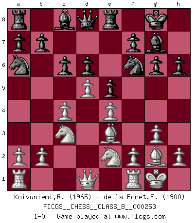 Last move : 1-0 2017 March 20 16:57:22 [Event "FICGS__CHESS__CLASS_B__000253"] [Site "FICGS"] [Date "2016.12.31"] [Round "1"] [White "Koivuniemi,Raimo"] [Black "de la Foret,Fred"] [Result "1-0"] [WhiteElo "1965"] [BlackElo "1900"] 1.g3 Nf6 2.Bg2 g6 3.e4 d6 4.d4 Bg7 5.Ne2 O-O 6.O-O Re8 7.c4 e5 8.d5 c6 9.Nbc3 Na6 10.Bg5 h6 11.Be3 1-0 Benko's Opening Kingside Castling by player Black (move 5) Kingside Castling by player White (move 6) Player White won this chess game. Follow this game move after move (download)After black's reply to 1.e4 with 1..e5, leaves him always trying to get into the game. (Howard Staunton) Kann Schach nicht schließlich das Nationalspiel der Deutschen werden? Und welche weiteren Ausblicke bieten sich dann dar! Welche Hebung des allgemeinen Kultur-Niveaus, ja der Moral, wenn das Schachbrett den Kartentisch verdrängen würde! Wahrlich, ein Ziel, des Schweißes der Edlen wert! (Siegbert Tarrasch) No es una movida, aún la mejor movida que tu debas buscar, sino un plan comprensible. (Eugene Znosko-Borovsky) A chaque perte on perd un peu de soi. (Joël Lautier) Computers are like Old Testament gods; lots of rules and no mercy. (Joseph Campbell)
