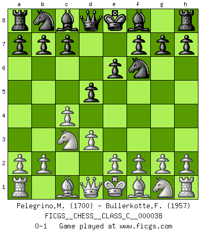 Last move : 0-1 2007 May 14 9:9:8 [Event "FICGS__CHESS__CLASS_C__000038"] [Site "FICGS"] [Date "2007.04.03"] [Round "1"] [White "Pelegrino,Matheus"] [Black "Bullerkotte,Frank"] [Result "0-1"] [WhiteElo "1700"] [BlackElo "1957"] 1.c4 Nf6 2.Nc3 e6 3.d3 d5 0-1 This chess game has been lost on time (started : 2007.04.03 12:49:28) English Opening Player Black won this chess game. Follow this game move after move (download)Chess is a sea in which a gnat may drink and an elephant may bathe. (Hindu proverb) Alles was ich jemals tun will ist Schach spielen. (Robert James Fischer) No existe un remordimiento como el remordimiento del Ajedrez. (H. G. Wells) Le système Elo représente seulement une moyenne. Il est simplement un indicateur de votre stabilité. (Anatoli Karpov) Creativity is allowing yourself to make mistakes. Art is knowing which ones to keep. (Scott Adams)