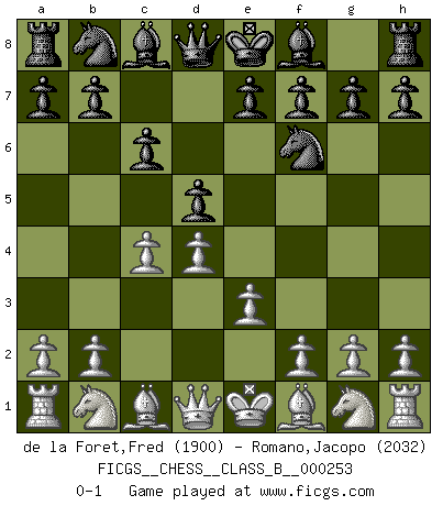 Last move : 0-1 2017 March 12 20:8:34 [Event "FICGS__CHESS__CLASS_B__000253"] [Site "FICGS"] [Date "2016.12.31"] [Round "1"] [White "de la Foret,Fred"] [Black "Romano,Jacopo"] [Result "0-1"] [WhiteElo "1900"] [BlackElo "2032"] 1.d4 d5 2.c4 c6 3.e3 Nf6 0-1 QGD Slav defense Player Black won this chess game. Follow this game move after move (download)Discovered check is the dive bomber of the Chessboard. (Reuben Fine) Ich bin der einzige Schachspieler, der sich während der Vorbereitungen zum Turnier verletzt hat. (Woody Allen) Una clavada es mas poderosa que una espada. (Fred Reinfeld) Le succès, c'est être capable d'aller d'échec en échec sans perdre son enthousiasme. (Winston Churchill) Difficult things take a long time, impossible things a little longer. (Author unknown)