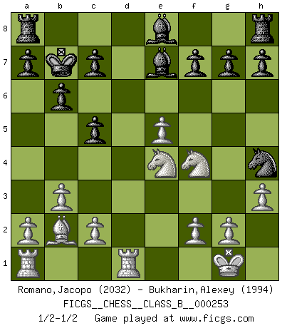 Last move : 1/2-1/2 2017 April 3 17:21:17 [Event "FICGS__CHESS__CLASS_B__000253"] [Site "FICGS"] [Date "2016.12.31"] [Round "1"] [White "Romano,Jacopo"] [Black "Bukharin,Alexey"] [Result "1/2-1/2"] [WhiteElo "2032"] [BlackElo "1994"] 1.e4 e5 2.Nf3 Nc6 3.Bb5 Nf6 4.O-O Nxe4 5.d4 Nd6 6.Bxc6 dxc6 7.dxe5 Nf5 8.Qxd8+ Kxd8 9.Nc3 Bd7 10.Rd1 Kc8 11.Ng5 Be8 12.b3 Be7 13.Nge4 b6 14.h3 Kb7 15.Bb2 Nh4 16.Ne2 c5 17.Nf4 1/2-1/2 Ruy Lopez : Berlin defense, Open variation Kingside Castling by player White (move 4) This chess game ended in a draw. Follow this game move after move (download)The isolated Pawn casts gloom over the entire chessboard. (Aaron Nimzovich) Das Schachspiel ist ein See, in welchem eine Mücke baden und ein Elefant ertrinken kann. (Emanuel Lasker) El juego del Ajedrez no es solamente una diversión quieta; algunas cualidades muy valuables de la mente se pueden adquirir y cultivar con el, como convertirlos en habitos disponibles para toda ocasión; ya que la vida es algo así como el Ajedrez. (Benjamin Franklin) Horreur, mais aussi harmonie suprême : qu'y avait-il en effet au monde en dehors des échecs ? Le brouillard, l'inconnu, le non-être... (Vladimir Nabokov) The large trees attract high winds. (Chinese proverb)