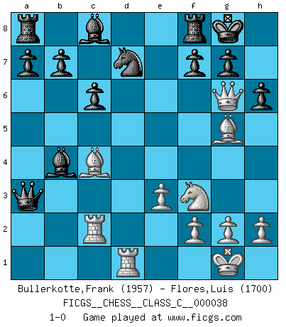 Last move : 1-0 2007 June 24 22:33:45 [Event "FICGS__CHESS__CLASS_C__000038"] [Site "FICGS"] [Date "2007.04.03"] [Round "1"] [White "Bullerkotte,Frank"] [Black "Flores,Luis"] [Result "1-0"] [WhiteElo "1957"] [BlackElo "1700"] 1.d4 d5 2.c4 e6 3.Nc3 Nf6 4.Bg5 c6 5.e3 Nbd7 6.Nf3 Qa5 7.cxd5 Nxd5 8.Qd2 Bb4 9.Rc1 O-O 10.Bd3 Re8 11.O-O e5 12.Qc2 h6 13.Bh4 exd4 14.Nxd5 Qxd5 15.Rfd1 Qxa2 16.Bc4 d3 17.Qxd3 Qxb2 18.Qg6 Rf8 19.Rc2 Qa3 20.Bg5 1-0 Comment by player 2 : Luis Flores : Good game! Congratulations !! QGD : 4.Bg5 Kingside Castling by player Black (move 9) Kingside Castling by player White (move 11) Player White won this chess game. Follow this game move after move (download)We don't really know how the game was invented, though there are suspicions. As soon as we discover the culprits, we'll let you know. (Bruce Pandolfini) Es hat in meinem Leben Zeiten gegeben, da ich sehr nahe daran war zu glauben, daß ich auch nicht eine einzige Schachpartie verlieren könnte. (José Raúl Capablanca) En posiciones complicadas, Bobby Fischer pocas veces tuvo que temer de cualquiera. (Paul Keres) Ce qui est bien, c'est d'avoir tout un tas de pièces en prise : l'adversaire ne peut en prendre qu'une à la fois. Cité par Thierry Audin. Computers make it easier to do a lot of things, but most of the things they make it easier to do don't need to be done. (Andy Rooney)