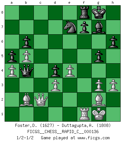 Last move : 1/2-1/2 2017 April 9 20:34:42 [Event "FICGS__CHESS__RAPID_C__000136"] [Site "FICGS"] [Date "2017.01.04"] [Round "1"] [White "Foster,Duncan"] [Black "Duttagupta,Aniruddha"] [Result "1/2-1/2"] [WhiteElo "1627"] [BlackElo "1808"] 1.e4 c5 2.a3 g6 3.b4 Bg7 4.Nc3 d6 5.g3 Nc6 6.Rb1 e6 7.Bg2 Nge7 8.Nge2 b6 9.O-O Bb7 10.d3 O-O 11.b5 Nd4 12.Nxd4 cxd4 13.Ne2 e5 14.c3 dxc3 15.Nxc3 d5 16.Qb3 d4 17.Na2 Qd7 18.f4 exf4 19.Bxf4 Rac8 20.a4 Rc5 21.Rbc1 Rxc1 22.Rxc1 Rc8 23.Rf1 a5 24.Bd2 Rf8 25.Nc1 h6 26.Ne2 g5 27.Bc1 Bc8 28.Bb2 Qd8 29.Qd1 Bg4 30.h3 Bxe2 31.Qxe2 Qd6 32.Qf2 Qb4 33.Qc2 1/2-1/2 Sicilian defense Kingside Castling by player White (move 9) Kingside Castling by player Black (move 10) This chess game ended in a draw. Follow this game move after move (download)A good player is always lucky. (Jose Raul Capablanca) Über Kasparov: Es ist offensichtlich, daß er in einem totalitären Staat aufwuchs und deshalb zu diktatorischen Zügen neigt. (Viktor Kortschnoi) Siempre es mucho mejor sacrificar las piezas de tu oponente. (Savielly Tartakover) Il n'y a pas de prix trop élevé au scalp de l'ennemi. (Koblentz) Art is the only way to run away without leaving home. (Twyla Tharp)