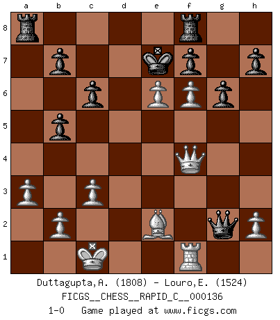 Last move : 1-0 2017 April 5 16:16:46 [Event "FICGS__CHESS__RAPID_C__000136"] [Site "FICGS"] [Date "2017.01.04"] [Round "1"] [White "Duttagupta,Aniruddha"] [Black "Louro,Eugenio"] [Result "1-0"] [WhiteElo "1808"] [BlackElo "1524"] 1.e4 c6 2.d4 d5 3.f3 Qb6 4.Nc3 e5 5.dxe5 Bc5 6.Na4 Qa5+ 7.c3 Bxg1 8.Rxg1 dxe4 9.Qd4 Ne7 10.Bg5 Nd7 11.Bxe7 Kxe7 12.f4 Re8 13.O-O-O Kf8 14.Qxe4 g6 15.Be2 Nb6 16.Nxb6 axb6 17.a3 Bf5 18.Qe3 Qa4 19.Bd3 Bg4 20.f5 Bxd1 21.Qh6+ Ke7 22.Rxd1 Qg4 23.e6 Rf8 24.Rf1 b5 25.Qe3 Kd6 26.Be2 Qxg2 27.Qf4+ Ke7 28.f6+ 1-0 Caro-Kann : Tartakower (fantasy) variation Queenside Castling by player White (move 13) Player White won this chess game. Follow this game move after move (download)Chess, like love, is infectious at any age. (Flohr) Den Ruhm habe ich schon, jetzt brauche ich noch das Geld. (Wilhelm Steinitz) El Ajedrez es el gimnasio de la mente. (Blaise Pascal) Les échecs sont plus proches de l'art de l'assassinat que de l'art de la guerre. (Arturo Perez-Reverte) All war is based on deception. (Sun Tzu)