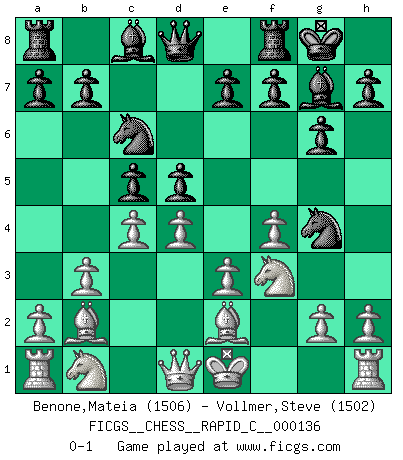 Last move : 0-1 2017 February 20 16:3:21 [Event "FICGS__CHESS__RAPID_C__000136"] [Site "FICGS"] [Date "2017.01.04"] [Round "1"] [White "Benone,Mateia"] [Black "Vollmer,Steve"] [Result "0-1"] [WhiteElo "1506"] [BlackElo "1502"] 1.f4 d5 2.Nf3 Nf6 3.e3 g6 4.b3 Bg7 5.Bb2 c5 6.c4 Nc6 7.Be2 O-O 8.d4 Ng4 0-1 This chess game has been lost on time (started : 2017.01.04 18:33:10) Bird's Opening Kingside Castling by player Black (move 7) Player Black won this chess game. Follow this game move after move (download)To avoid losing a piece, many a person has lost the game. (Savielly Tartakover) Ich tröste mich mit dem Vergnügen, daß Schachfans, Zuschauer und Leser glücklich sind, wenn ein Großmeister etwas riskiert, statt nur Klötzchen zu schieben. (Mikhail Nekhemyevich Tal) El Ajedrez, como cualquier otra actividad creativa, puede existir solo a través de méritos combinados de aquellos que tienen talento creativo y de aquellos que tienen la habilidad de organizar un trabajo creativo. (Mikhail Botvinnik) C'est une question de caractère, Beaucoup de gens perdent leur motivation très vite. D'autres, ils sont rares, peuvent la conserver très longtemps. J'aime les échecs, encore aujourd'hui je suis heureux d'analyser des parties. J'aime toujours gagner, je déteste encore perdre. Bien jouer est important pour mon intégrité intellectuelle et morale. Et puis les échecs vivent en ce moment une période historique grâce à Internet. Ils se développent dans les systèmes éducatifs à travers le monde. Ils sortent de leur ghetto, et c'est mon rôle de mener à bien cette révolution. (Gary Kasparov) The human is the only animal species whose members are able to talk themselves into difficulties that would not otherwise exist. (Wendell Johnson)