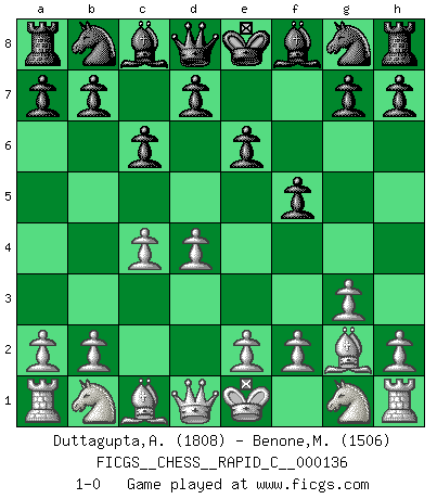Last move : 1-0 2017 February 22 4:36:38 [Event "FICGS__CHESS__RAPID_C__000136"] [Site "FICGS"] [Date "2017.01.04"] [Round "1"] [White "Duttagupta,Aniruddha"] [Black "Benone,Mateia"] [Result "1-0"] [WhiteElo "1808"] [BlackElo "1506"] 1.d4 f5 2.c4 e6 3.g3 c6 4.Bg2 1-0 This chess game has been lost on time (started : 2017.01.04 18:33:10) Dutch defense Player White won this chess game. Follow this game move after move (download)I like to say that Bobby Fischer was the greatest player ever. But what made Fischer a genius was his ability to blend an American freshness and pragmatism with Russian ideas about strategy. (Bruce Pandolfini) Das typische an einem Großmeister ist, daß er eine gewonnene Position schnell und schmerzlos gewinnt. (Irving Chernev) Aquellos que dicen entender al Ajedrez, no entienden nada. (Robert Hubner) La solitude du joueur d'Echecs à l'approche du mat est semblable à celle du condamné. (Francis Szpiner) Programming can only do so much before it becomes too much. (Don Groves)