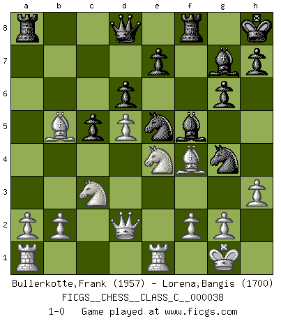 Last move : 1-0 2007 July 17 23:22:22 [Event "FICGS__CHESS__CLASS_C__000038"] [Site "FICGS"] [Date "2007.04.03"] [Round "1"] [White "Bullerkotte,Frank"] [Black "Lorena,Bangis"] [Result "1-0"] [WhiteElo "1957"] [BlackElo "1700"] 1.d4 Nf6 2.c4 g6 3.Nc3 Bg7 4.e4 O-O 5.Be2 d6 6.Be3 c5 7.d5 a6 8.Qd2 Kh8 9.Nf3 b5 10.cxb5 Ng4 11.Bg5 axb5 12.Bxb5 f6 13.Bf4 f5 14.O-O fxe4 15.Ng5 Bf5 16.Ngxe4 Nd7 17.Rfe1 Nde5 18.h3 1-0 This chess game has been lost on time (started : 2007.04.03 12:49:28) King's Indian : 4.e4 Kingside Castling by player Black (move 4) Kingside Castling by player White (move 14) Player White won this chess game. Follow this game move after move (download)Place the contents of the Chess box in a hat, shake them up vigorously, pour them on the board from a height of two feet, and you get the style of Steinitz. (H. E. Bird) Der beste Spieler in einem Turnier gewinnt es nie. Er landet auf Platz zwei oder drei. (Siegbert Tarrasch) Buenas posiciones no logran ganar juegos, buenas movidas sí. (Gerald Abrahams) On entre au jeu d'Echecs comme on entre en Religion. Pour le joueur d'Echecs, la partie d'Echecs c'est l'office, la messe, le défilé du 1er Mai, le dépôt de gerbe au Monument aux Morts. C'est un drame sacré. (Michel Roos) Every man's memory is his private literature. (Aldous Huxley)