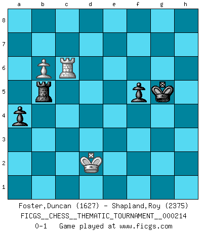 Last move : 0-1 2017 October 8 22:0:22 [Event "FICGS__CHESS__THEMATIC_TOURNAMENT__000214"] [Site "FICGS"] [Date "2017.01.12"] [Round "1"] [White "Foster,Duncan"] [Black "Shapland,Roy"] [Result "0-1"] [WhiteElo "1627"] [BlackElo "2375"] 1.e4 e5 2.Nf3 Nc6 3.Nc3 Nf6 4.d4 exd4 5.Nd5 Nb4 6.Bc4 Nbxd5 7.exd5 Bb4+ 8.Bd2 Qe7+ 9.Qe2 O-O 10.Qxe7 Bxe7 11.O-O Bc5 12.b4 Bb6 13.a4 a5 14.d6 Ne4 15.Bf4 Nxd6 16.Bxd6 cxd6 17.b5 Bc5 18.Rfd1 b6 19.Nxd4 Bb7 20.Nf5 Be4 21.Nxd6 Bxc2 22.Rd2 Bg6 23.Rd5 Rfb8 24.h4 Bxd6 25.Rxd6 Kf8 26.Bd3 Ke7 27.Rd4 Re8 28.Bxg6 hxg6 29.Rad1 Ra7 30.g3 Kd8 31.Rf4 Re7 32.Rd6 Re6 33.Rd2 d6 34.Rc2 d5 35.f3 Rae7 36.Rd4 Re5 37.Rc6 R7e6 38.Rc1 Re1+ 39.Rxe1 Rxe1+ 40.Kf2 Re5 41.g4 Ke7 42.Rd1 Kd6 43.Rc1 Re6 44.Rc6+ Kd7 45.Rc1 d4 46.Rd1 Rd6 47.Rc1 Ke6 48.Ke1 Kd5 49.Rc7 Re6+ 50.Kd2 Rf6 51.Ke2 Rf4 52.Rc6 d3+ 53.Kxd3 Rxf3+ 54.Kc2 Ra3 55.Rxb6 Rxa4 56.Rb7 Rf4 57.Rc7 Ke6 58.b6 Rxg4 59.Rc6+ Ke7 60.Rc7+ Kf6 61.Rc6+ Ke5 62.Rc5+ Kd6 63.Rc7 f5 64.Rxg7 Rxh4 65.Rxg6+ Ke5 66.Rc6 Rb4 67.Rc5+ Kf4 68.Rc6 Kg5 69.Kc3 Rb1 70.Kc2 Rb5 71.Kd2 a4 0-1 Roy Shapland Well played. For long time a drawn game. 14. d6! great move. 48.Ke1! especially hard to find. 67.Rc5? was error. 67.Kd3 draws because 67...a4 68.Rc5+ Kf4 69.Rc4+ Rc4: 70.Kxc4 and b pawn wins. So instead 68.Rc5+ Kf6 69.Rc4 Rxb6 70.Rxa4 and now White can stop f-pawn in ending. My move 8...Qe7+?! was not good. A better attempt is 8...Bxd2+ 9.Qxd2 Qe7+. Thanks for the game! Four knights : Belgrade gambit Kingside Castling by player Black (move 9) Kingside Castling by player White (move 11) 10 pieces endgame at move 58 : White KRPP , Black KRPPPP WHITE : King + 1 Rook 2 Pawns BLACK : King + 1 Rook 4 Pawns 9 pieces endgame at move 64 : White KRPP , Black KRPPP WHITE : King + 1 Rook 2 Pawns BLACK : King + 1 Rook 3 Pawns 8 pieces endgame at move 64 : White KRP , Black KRPPP WHITE : King + 1 Rook 1 Pawn BLACK : King + 1 Rook 3 Pawns 7 pieces endgame at move 65 : White KRP , Black KRPP WHITE : King + 1 Rook 1 Pawn BLACK : King + 1 Rook 2 Pawns Player Black won this chess game. Follow this game move after move (download)Do you realize Fischer almost never has any bad pieces? He exchanges them, and the bad pieces remain with his opponents. (Yuri Balashov) Wenn Spassky eine Figur opfert kannst du genauso gut aufgeben. Aber wenn Tal eine Figur opfert, spiel weiter. Er könnte noch eine weitere opfern, und dann ... wer weiß? (Miguel Najdorf) Yo tuve un dolor de muelas en la primer partida. En el segundo juego, tuve un dolor de cabeza. En el tercero, tuve un ataque de reumatísmo. En la cuarta partida, no me sentía muy bien. ¿Y en el quinto juego? Bueno, ¿que acaso uno tiene que ganar todos los juegos?. (Siegbert Tarrasch) Même un GMI sait rarement calculer sur plus de cinq coups une attaque à sacrifices. (Rudolf Spielmann) Real knowledge is to know the extent of one's ignorance. (Confucius)