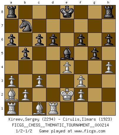 Last move : 1/2-1/2 2017 February 15 12:41:44 [Event "FICGS__CHESS__THEMATIC_TOURNAMENT__000214"] [Site "FICGS"] [Date "2017.01.12"] [Round "1"] [White "Kireev,Sergey"] [Black "Cirulis,Ilmars"] [Result "1/2-1/2"] [WhiteElo "2294"] [BlackElo "1923"] 1.e4 e5 2.Nf3 Nc6 3.Nc3 Nf6 4.d4 exd4 5.Nd5 Nb4 6.Nxf6+ Qxf6 7.a3 Nc6 8.Bd3 Be7 9.O-O d6 10.Bb5 Bg4 11.Qxd4 Bxf3 12.Qxf6 Bxf6 13.gxf3 g5 14.c3 Be5 15.h4 h6 16.Rd1 a6 17.Ba4 b5 18.Bb3 Na5 19.Bd5 c6 20.Ba2 Nb7 21.Kf1 f6 22.Ke2 1/2-1/2 Four knights : Belgrade gambit Kingside Castling by player White (move 9) This chess game ended in a draw. Follow this game move after move (download)When you don't know what to do, wait for your opponent to get an idea - it's sure to be wrong. (Tarrasch) Bobby Fischer ist kein Vorbild für die heutige Jugend. (Viktor Kortschnoi) Fischer es una tragedia del Ajedrez Americano a la par con Morphy y Pillsbury. (Mig Greengard) Un millionnaire : 'Monsieur Steinitz ! Vous ne participez aux tournois que pour l'argent, alors que moi je n'y viens que pour l'honneur.' Steinitz : 'Chacun joue pour ce qu'il n'a pas'... You must have a dream in order to have it come true. (A.P.J. Kalam)