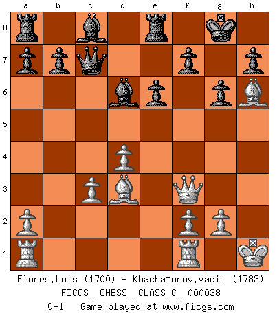 Last move : 0-1 2007 July 12 12:6:26 [Event "FICGS__CHESS__CLASS_C__000038"] [Site "FICGS"] [Date "2007.04.03"] [Round "1"] [White "Flores,Luis"] [Black "Khachaturov,Vadim"] [Result "0-1"] [WhiteElo "1700"] [BlackElo "1782"] 1.e4 c5 2.c3 Nf6 3.e5 Nd5 4.d4 cxd4 5.Nf3 e6 6.cxd4 d6 7.Bc4 Nc6 8.O-O Be7 9.Qe2 O-O 10.Nc3 Nxc3 11.bxc3 dxe5 12.Nxe5 Nxe5 13.Qxe5 Bd6 14.Qh5 Qc7 15.Bd3 g6 16.Qf3 Bxh2+ 17.Kh1 Bd6 18.Bh6 Re8 0-1 Sicilian : Alapin's variation (2.c3) Kingside Castling by player White (move 8) Kingside Castling by player Black (move 9) Player Black won this chess game. Follow this game move after move (download)A Chess game is a dialogue, a conversation between a player and his opponent. Each move by the opponent may contain threats or be a blunder, but a player cannot defend against threats or take advantage of blunders if he does not first ask himself: What is my opponent planning after each move ? (Bruce A. Moon) Er war ein guter Schachspieler, aber ich kann Leute nicht ausstehen, die 'Heil Hitler' rufen (Über Alexander Aljechin). (Miguel Najdorf) Sin errores no puede haber brillantez. (Emanuel Lasker) Votre prénom est 'Tactique', votre deuxième prénom est 'Tactique' et votre nom est 'Tactique'. (Ken Smith) I think your argument is specious - I think your tie is ugly. (Gregory House to Dr. Foreman, House M.D.)