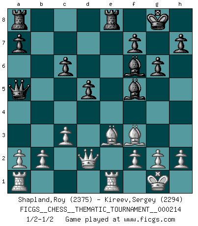 Last move : 1/2-1/2 2017 February 13 12:36:54 [Event "FICGS__CHESS__THEMATIC_TOURNAMENT__000214"] [Site "FICGS"] [Date "2017.01.12"] [Round "1"] [White "Shapland,Roy"] [Black "Kireev,Sergey"] [Result "1/2-1/2"] [WhiteElo "2375"] [BlackElo "2294"] 1.e4 e5 2.Nf3 Nc6 3.Nc3 Nf6 4.d4 exd4 5.Nd5 Be7 6.Nxd4 Nxd5 7.exd5 Nxd4 8.Qxd4 O-O 9.Be2 Bf6 10.Qd3 d6 11.O-O Re8 12.Re1 g6 13.c3 Bf5 14.Qd1 c5 15.dxc6 bxc6 16.Be3 d5 17.Qd2 Qa5 18.Bf3 1/2-1/2 Four knights : Belgrade gambit Kingside Castling by player Black (move 8) Kingside Castling by player White (move 11) This chess game ended in a draw. Follow this game move after move (download)When your house is on fire, you can't be bothered with the neighbors. Or, as we say in Chess, if your King is under attack you don't worry about losing a Pawn on the Queen's side. (Gary Kasparov) Es ist schade, dass viele Schachsportler vergessen, wie wichtig Auftreten und angemessene Kleidung sind. (Alexandra Kosteniuk) Ser exitoso en el Ajedrez te permite descubrir tu propia personalidad. Eso es lo que deseo para los niños de mi clase. (Saudin Robovic) Il vaut mieux sacrifier les pièces de l'adversaire. (Xavier Tartacover) Empty your mind, be formless, shapeless — like water. (Bruce Lee)