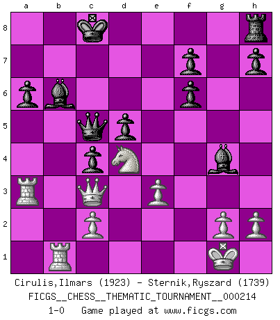 Last move : 1-0 2017 February 18 13:32:1 [Event "FICGS__CHESS__THEMATIC_TOURNAMENT__000214"] [Site "FICGS"] [Date "2017.01.12"] [Round "1"] [White "Cirulis,Ilmars"] [Black "Sternik,Ryszard"] [Result "1-0"] [WhiteElo "1923"] [BlackElo "1739"] 1.e4 e5 2.Nf3 Nc6 3.Nc3 Nf6 4.d4 exd4 5.Nd5 Nxe4 6.Bd3 Nf6 7.Qe2+ Be7 8.Nxf6+ gxf6 9.Bh6 d5 10.Bb5 a6 11.Bxc6+ bxc6 12.O-O c5 13.b4 cxb4 14.Nxd4 Qd6 15.Rfe1 Be6 16.Qf3 O-O-O 17.a3 bxa3 18.Qd3 Rde8 19.Bc1 c5 20.Bf4 c4 21.Qe3 Qc5 22.Reb1 Bd8 23.Rxa3 Bg4 24.Qc3 Bb6 25.Be3 Rxe3 26.fxe3 1-0 Four knights : Belgrade gambit Kingside Castling by player White (move 12) Queenside Castling by player Black (move 16) Player White won this chess game. Follow this game move after move (download)In Chess, as it is played by masters, chance is practically eliminated. (Emanuel Lasker) Karpov ist ein Museumsstück. (Garry Kasparov) ¡Examina movidas que hagan daño! Un buen ojo for movidas desvastantes es mucho mas importante que el conocimiento de principios estratégicos. (Purdy) Les échecs sont un jeu terrible. Si vous n'avez pas le centre, votre adversaire a une position plus libre. Par contre, si vous avez le centre, alors vous avez vraiment quelque chose pour laquelle vous inquiéter ! (Siegbert Tarrasch) Tree pose grows confidence. It roots me to this world. (Terri Guillemets)