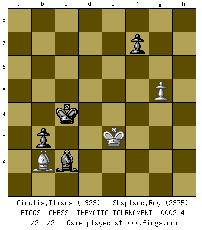 Last move : 1/2-1/2 2017 July 25 14:57:26 [Event "FICGS__CHESS__THEMATIC_TOURNAMENT__000214"] [Site "FICGS"] [Date "2017.01.12"] [Round "1"] [White "Cirulis,Ilmars"] [Black "Shapland,Roy"] [Result "1/2-1/2"] [WhiteElo "1923"] [BlackElo "2375"] 1.e4 e5 2.Nf3 Nc6 3.Nc3 Nf6 4.d4 exd4 5.Nd5 Nb4 6.Nxf6+ Qxf6 7.Bb5 a6 8.Ba4 c5 9.Bg5 Qe6 10.O-O Nc6 11.Bxc6 dxc6 12.c3 h6 13.Bh4 g5 14.Bg3 Bg7 15.cxd4 cxd4 16.Nxd4 Qc4 17.e5 O-O 18.Nb3 Be6 19.f4 gxf4 20.Bxf4 Rad8 21.Qe1 Qa4 22.Qg3 Kh7 23.Nc5 Qd4+ 24.Qf2 Bc8 25.Rae1 Qxf2+ 26.Rxf2 Rd5 27.Ne4 Re8 28.h3 Be6 29.b3 Red8 30.Nd6 b5 31.Ref1 Rd7 32.Re2 c5 33.Rf3 b4 34.Ne8 a5 35.Nxg7 Kxg7 36.Be3 Rd8 37.Kf2 Rc8 38.Rf4 h5 39.Rh4 Kg6 40.Rc2 Rxe5 41.g4 hxg4 42.hxg4 c4 43.bxc4 Rxc4 44.Rxc4 Bxc4 45.Rh6+ Kg7 46.Rc6 Bb5 47.Bd4 Bxc6 48.Bxe5+ Kg6 49.Bc7 a4 50.Ba5 b3 51.axb3 axb3 52.Bc3 Kg5 53.Kg3 Be4 54.Bd2+ Kf6 55.Bc3+ Ke6 56.Kf4 Kd5 57.Ke3 Kc4 58.Bb2 Bc2 59.g5 Kb4 60.Kd4 Bf5 61.Ke5 Bg4 62.Kf6 Bh5 63.Ke5 Kc4 64.Ke4 Bd1 65.Be5 Be2 66.Bb2 Bf1 67.Be5 Bg2+ 68.Ke3 Kb4 69.Bb2 Kc4 70.Be5 Bh3 71.Bb2 Bf5 72.Be5 Kb4 73.Bb2 Bg6 74.Kd4 Bc2 75.Kd5 Bg6 76.Kd4 Bb1 77.Bc1 Bh7 78.Bb2 Bf5 79.Ke3 Kc4 80.Kf4 Bg6 81.Ke3 Bc2 1/2-1/2 Four knights : Belgrade gambit Kingside Castling by player White (move 10) Kingside Castling by player Black (move 17) 10 pieces endgame at move 47 : White KBPP , Black KRBPPP WHITE : King + 1 Bishop 2 Pawns BLACK : King + 1 Rook 1 Bishop 3 Pawns 9 pieces endgame at move 48 : White KBPP , Black KBPPP WHITE : King + 1 Bishop 2 Pawns BLACK : King + 1 Bishop 3 Pawns 8 pieces endgame at move 51 : White KBPP , Black KBPP WHITE : King + 1 Bishop 2 Pawns BLACK : King + 1 Bishop 2 Pawns 7 pieces endgame at move 51 : White KBP , Black KBPP WHITE : King + 1 Bishop 1 Pawn BLACK : King + 1 Bishop 2 Pawns This chess game ended in a draw. Follow this game move after move (download)The passed pawn is a criminal, who should be kept under lock and key. Mild measures, such as police surveillance, are not sufficient. (Nimzovitch) Ich verstehe den Grund nicht, warum die Aufteilung in Frauen und Männer überhaupt im Schach besteht. (Judith Polgar) Bobby es la celebridad menos entendida y malinterpretada que camina el la faz de esta tierra. (Yasser Seirawan) Les ravages du H expliquent la différence de niveau entre Tal et Thal [Abergel]. God, you are such an idiot. - Actually, I thought I was more of a jerk. (Gregory House to Stacy Warner, House M.D.)