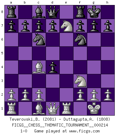 Last move : 1-0 2017 March 13 10:31:26 [Event "FICGS__CHESS__THEMATIC_TOURNAMENT__000214"] [Site "FICGS"] [Date "2017.01.12"] [Round "1"] [White "Teverovski,Bogoljub"] [Black "Duttagupta,Aniruddha"] [Result "1-0"] [WhiteElo "2081"] [BlackElo "1808"] 1.e4 e5 2.Nf3 Nc6 3.Nc3 Nf6 4.d4 exd4 5.Nd5 Be7 6.Bc4 O-O 7.O-O Nxe4 8.Re1 Nf6 9.Nxe7+ 1-0 Four knights : Belgrade gambit Kingside Castling by player Black (move 6) Kingside Castling by player White (move 7) Player White won this chess game. Follow this game move after move (download)Many have become Chess Masters, no one has become the Master of Chess. (Siegbert Tarrasch) Der vorletzte Fehler gewinnt. (Savielly Grigorievitsch Tartakower) Debemos de asegurarnos de que el Ajedrez no se convierta en un lenguaje muerto, muy interesante, pero solo para un grupo muy pequeño. (Sytze Faber) Les échecs c'est le défi de l'alpiniste, toujours plus haut, prêt à tout pour monter à l'assaut du Roi ennemi. Les échecs, c'est de la musique en mouvement, un ballet majestueux pour les yeux. C'est de la poésie composée par les fantômes du passé qui au même titre que Rimbaud ou Verlaine méritent notre admiration. Les échecs, c'est de la peinture ou le moindre mouvement modifie le tableau pour en faire un Picasso ou un Van Gogh. Les échecs, c'est tout et rien, c'est la vie et la mort. Jjulie33 sur le forum de France-Echecs. I know the human being and fish can coexist peacefully. (George W. Bush, Saginaw sept. 29, 2000)