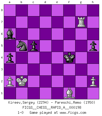 Last move : 1-0 2017 May 1 22:59:3 [Event "FICGS__CHESS__RAPID_A__000198"] [Site "FICGS"] [Date "2017.01.12"] [Round "1"] [White "Kireev,Sergey"] [Black "Pareschi,Remo"] [Result "1-0"] [WhiteElo "2294"] [BlackElo "1950"] 1.e4 e5 2.Nf3 Nc6 3.Bc4 Nf6 4.Ng5 d5 5.exd5 b5 6.Bf1 Nd4 7.c3 Nxd5 8.cxd4 Qxg5 9.Bxb5+ Kd8 10.O-O Bb7 11.Qf3 Rb8 12.dxe5 Ne3 13.Qh3 Qxg2 14.Qxg2 Nxg2 15.d4 f6 16.Be2 Nh4 17.f4 Bb4 18.Na3 Nf5 19.Nc4 Bd5 20.Rd1 fxe5 21.dxe5 Bc5+ 22.Kf1 Bd4 23.Na3 c5 24.Nc2 Ke7 25.Nxd4 Nxd4 26.b3 Rhf8 27.Be3 Rxf4 28.Bxf4 Rf8 29.Rd2 Rxf4+ 30.Kg1 Rf5 31.Bd1 Rg5 32.Kf2 Rf5+ 33.Kg1 Rg5+ 34.Kf2 Rf5+ 35.Ke3 Rxe5+ 36.Kd3 Bf7 37.Rf2 g5 38.Rc1 Be6 39.Rg2 Bf7 40.Kd2 Rd5 41.Rc3 Nxb3+ 42.Kc2 Nd4+ 43.Kb2 a5 44.Re3+ Kd6 45.Reg3 Rf5 46.Rxg5 Rf1 47.Bc2 h6 48.R5g4 h5 49.Rg7 Kc6 50.Be4+ Kd6 51.Rd2 Rf6 52.Rg5 Rf1 53.Rf5 Rxf5 54.Bxf5 Ke5 55.Bh3 Bc4 56.Rg2 Kf4 57.Rg7 Bd3 58.Kc3 Be2 59.Re7 a4 60.Bg2 Ba6 61.Re4+ Kf5 62.Re8 Nb5+ 63.Kb2 Nc7 64.Re7 Nb5 65.Bf1 Kf4 66.Rg7 1-0 Two knights defense : Ulvestad variation Kingside Castling by player White (move 10) Player White won this chess game. Follow this game move after move (download)When you are lonely, when you feel yourself an alien in the world, play Chess. This will raise your spirits and be your counselor in war. (Aristotle) Gegen einen Schachcomputer zu verlieren ist wie Löcher in den Strümpfen zuhaben. Es ist nicht peinlich, solange man der einzige ist der es weiß. (Anonymous) El arma más poderosa en el Ajedrez, es tener la próxima movida. (David Bronstein) Plusieurs personnes se sont demandées comment Tal faisait pour gagner... En fait, c'est très simple ! Il met ses pièces au centre de l'échiquier et les sacrifie quelque part ! (David Bronstein) Internal peace cannot coexist with external war. (Don Groves)