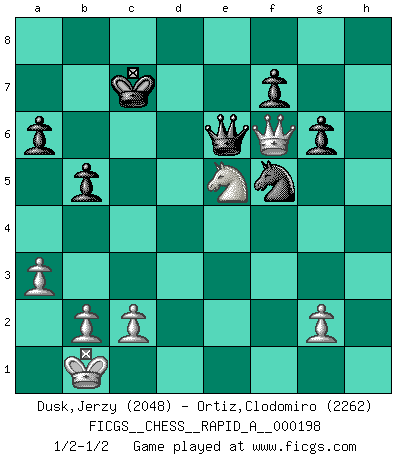 Last move : 1/2-1/2 2017 January 28 15:15:18 [Event "FICGS__CHESS__RAPID_A__000198"] [Site "FICGS"] [Date "2017.01.12"] [Round "1"] [White "Dusk,Jerzy"] [Black "Ortiz,Clodomiro"] [Result "1/2-1/2"] [WhiteElo "2048"] [BlackElo "2262"] 1.e4 g6 2.d4 Bg7 3.Nc3 d6 4.Be3 a6 5.f4 b5 6.Nf3 Bb7 7.Bd3 Nd7 8.e5 c5 9.Be4 Bxe4 10.Nxe4 Nh6 11.dxc5 Ng4 12.Qe2 dxe5 13.O-O-O Qc7 14.fxe5 Ngxe5 15.h4 O-O 16.h5 Rad8 17.hxg6 hxg6 18.Bd4 Ng4 19.a3 Ndf6 20.Nxf6+ exf6 21.Qe1 Nh6 22.Qh4 Qc6 23.Bf2 Rxd1+ 24.Rxd1 Nf5 25.Qh3 Re8 26.Ne1 Bh6+ 27.Kb1 Be3 28.Nd3 Bxf2 29.Nxf2 Qxc5 30.Ng4 Qc6 31.Rh1 Kf8 32.Qh8+ Ke7 33.Re1+ Kd8 34.Rxe8+ Qxe8 35.Qxf6+ Kc7 36.Ne5 Qe6 1/2-1/2 Robatsch (Modern) defense Queenside Castling by player White (move 13) Kingside Castling by player Black (move 15) This chess game ended in a draw. Follow this game move after move (download)At this time Fischer is simply a level above all the best Chessplayers in the world. (John Jacobs) Kasparov ist eine Art Monster mit hundert Augen, denen auch nicht das Geringste entgeht. (Tony Miles) Nunca nadie ha ganado una partida de Ajedrez rindiendose. (Unknown) Des idées, des idées, j'en ai cent, j'en ai mille. Des bonnes, des mauvaises, applicables, irréalisables... Il suffit de faire le tri ! (Roos) When you've done things right people won't know you've done anything at all. (Futurama)