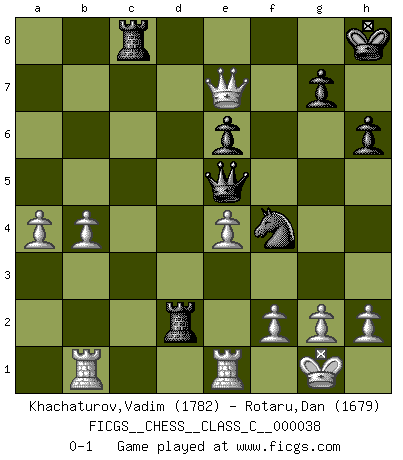 Last move : 0-1 2007 May 15 0:51:47 [Event "FICGS__CHESS__CLASS_C__000038"] [Site "FICGS"] [Date "2007.04.03"] [Round "1"] [White "Khachaturov,Vadim"] [Black "Rotaru,Dan"] [Result "0-1"] [WhiteElo "1782"] [BlackElo "1679"] 1.e4 c5 2.Nf3 d6 3.d4 cxd4 4.Nxd4 Nc6 5.Nc3 a6 6.Be2 e5 7.Nxc6 bxc6 8.O-O Nf6 9.Qd3 Be7 10.Qg3 O-O 11.a4 Rb8 12.b3 Rb4 13.Bc4 Be6 14.Bxe6 fxe6 15.Re1 Qe8 16.Qd3 a5 17.Qa6 Rb8 18.Qxa5 d5 19.Ba3 Bxa3 20.Rxa3 Qe7 21.R3a1 Ra8 22.Qb6 Rfb8 23.Qe3 d4 24.Qg5 dxc3 25.Qxe5 c5 26.Rad1 c4 27.Qxc3 Rc8 28.Qe5 Rab8 29.Rb1 Nd7 30.Qd4 cxb3 31.cxb3 Nc5 32.Qe3 Rd8 33.Qc3 Qa7 34.Qc4 Nd3 35.Re2 Kh8 36.Qc2 Rbc8 37.Qd2 Qb8 38.Qg5 h6 39.Qe7 Nf4 40.R2e1 Qe5 41.b4 Rd2 0-1 Sicilian Kingside Castling by player White (move 8) Kingside Castling by player Black (move 10) Player Black won this chess game. Follow this game move after move (download)My opponents make good moves too. Sometimes I don't take these things into consideration. (Bobby Fischer) Mit sehr nachdenklichem Gesicht schreitet Bobby durch den Turniersaal. Was ist passiert?, fragt Lombardy. Ich stehe schlecht, antwortet Fischer. Lombardy: Dann biete doch einfach Remis an. Fischer: So schlecht stehe ich nun auch wieder nicht! (Robert James Fischer) No es suficiente ser un buen jugador, se debe también de jugar bién. (Siegbert Tarrasch) Le jeu d'échecs fait naître et fortifie en nous plusieurs qualités précieuses dans le cours de l'existence, telles que la prévoyance, la circonspection, la prudence, et la persévérance. (Benjamin Franklin - 1783, la morale des échecs) There is no instance of a country having benefited from prolonged warfare. (Sun Tzu)
