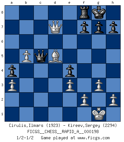 Last move : 1/2-1/2 2017 February 26 17:20:51 [Event "FICGS__CHESS__RAPID_A__000198"] [Site "FICGS"] [Date "2017.01.12"] [Round "1"] [White "Cirulis,Ilmars"] [Black "Kireev,Sergey"] [Result "1/2-1/2"] [WhiteElo "1923"] [BlackElo "2294"] 1.b4 e5 2.a3 d5 3.Bb2 Nd7 4.e3 a5 5.d4 exd4 6.Qxd4 Ngf6 7.Nf3 Bd6 8.Be2 O-O 9.O-O Qe7 10.b5 c5 11.bxc6 bxc6 12.c4 Ba6 13.Ra2 Rfb8 14.Qd1 a4 15.Nd4 Qe5 16.g3 Rxb2 17.Rxb2 c5 18.Re1 Bc7 19.Nb5 Ba5 20.Rc2 Bxe1 21.Qxe1 Rb8 22.Qd1 Bxb5 23.cxb5 c4 24.Nc3 Nc5 25.Bf3 Nd3 26.Be2 Ne4 27.Nxe4 dxe4 28.Rxc4 Nb2 29.Qd7 Nxc4 30.Bxc4 Qc5 31.Bd5 Rf8 1/2-1/2 Polish (Sokolsky) opening Kingside Castling by player Black (move 8) Kingside Castling by player White (move 9) This chess game ended in a draw. Follow this game move after move (download)It is not enough to be a good player... you must also play well. (Siegbert Tarrasch) Wenn Dein Gegner dir ein Remis anbietet, versuch herauszufinden, weshalb er glaubt schlechter zu stehen. (Nigel Short) Al jugar al Ajedrez entonces, podemos aprender: Primero: Previsión... Segundo: Prudencia... Tercero: Cautela... Y al final, aprendemos del Ajedrez el hábito de no ser desanimados por apariencias malas presentes en el estado de nuestros asuntos, el hábito de la esperanza por una oportunidad favorable y la perseveración de los secretos de los recursos. (Benjamin Franklin) Ce qui est bien, c'est d'avoir tout un tas de pièces en prise : l'adversaire ne peut en prendre qu'une à la fois. Cité par Thierry Audin. I don't diet. I just don't eat as much as I'd like to. (Linda Evangelista, supermodel)