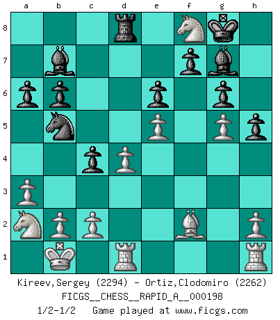 Last move : 1/2-1/2 2017 February 2 12:43:27 [Event "FICGS__CHESS__RAPID_A__000198"] [Site "FICGS"] [Date "2017.01.12"] [Round "1"] [White "Kireev,Sergey"] [Black "Ortiz,Clodomiro"] [Result "1/2-1/2"] [WhiteElo "2294"] [BlackElo "2262"] 1.e4 g6 2.d4 Bg7 3.Nc3 d6 4.Be3 a6 5.Qd2 b5 6.f3 Nd7 7.O-O-O Bb7 8.Kb1 Rc8 9.g4 h5 10.g5 Nb6 11.a3 d5 12.Nh3 e6 13.Nf4 Nc4 14.Bxc4 bxc4 15.Na4 Ne7 16.Nc5 Rb8 17.Ne2 O-O 18.Nc3 Qd6 19.Bf2 Qc6 20.N3a4 Nc8 21.Qa5 Nd6 22.Nc3 Nb5 23.Na2 dxe4 24.fxe4 Qd6 25.e5 Qb6 26.Qxb6 cxb6 27.Nd7 Rbd8 28.Nxf8 1/2-1/2 Robatsch (Modern) defense Queenside Castling by player White (move 7) Kingside Castling by player Black (move 17) This chess game ended in a draw. Follow this game move after move (download)A man without frontiers. He didn't divide the East and the West, he brought them together in their admiration for him. (Ljubomir Ljubojevic, about Bobby Fischer's death) Ich organisiere ein großes Turnier, was mich etwa 120000 Dollar kostet. Ich denke, das ist das erste Mal in der Schachgeschichte, daß ein Schachgroßmeister auch als Mäzen auftritt. (Miguel Najdorf) Si tu oponente te ofrece un empate, trata de averiguar porque piensa él que esta en una posición peor. (Nigel Short) J'ai toujours senti une vague pitié pour l'homme qui ne connaît rien aux échecs, tout comme j'en aurais pour un homme ignorant de l'amour. Les Echecs, comme la musique ou comme l'amour, ont le pouvoir de rendre heureux. (Siegbert Tarrasch) Every man's memory is his private literature. (Aldous Huxley)