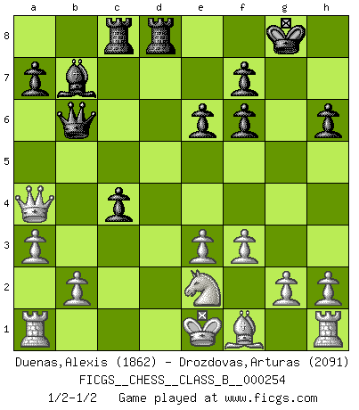 Last move : 1/2-1/2 2017 January 28 19:27:22 [Event "FICGS__CHESS__CLASS_B__000254"] [Site "FICGS"] [Date "2017.01.14"] [Round "1"] [White "Duenas,Alexis"] [Black "Drozdovas,Arturas"] [Result "1/2-1/2"] [WhiteElo "1862"] [BlackElo "2091"] 1.d4 Nf6 2.c4 e6 3.Nc3 Bb4 4.Qc2 O-O 5.a3 Bxc3+ 6.Qxc3 b6 7.Bg5 Bb7 8.f3 h6 9.Bh4 d5 10.e3 c5 11.dxc5 Nbd7 12.cxb6 Qxb6 13.Bxf6 gxf6 14.Ne2 Rac8 15.Qd4 dxc4 16.Qxd7 Rfd8 17.Qa4 1/2-1/2 Nimzo-Indian : Classical variation Kingside Castling by player Black (move 4) This chess game ended in a draw. Follow this game move after move (download)I still hope to kill Fischer. (Boris Spassky) Immer nach dem besten Zug zu suchen ist ziemlich unpraktisch. (Nigel Short) Buenas posiciones no logran ganar juegos, buenas movidas sí. (Gerald Abrahams) Un millionnaire : 'Monsieur Steinitz ! Vous ne participez aux tournois que pour l'argent, alors que moi je n'y viens que pour l'honneur.' Steinitz : 'Chacun joue pour ce qu'il n'a pas'... Remember : Your focus determines your reality. (Qui-Gon Jinn in Star Wars ep.1)