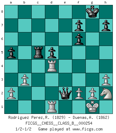 Last move : 1/2-1/2 2017 March 2 23:26:6 [Event "FICGS__CHESS__CLASS_B__000254"] [Site "FICGS"] [Date "2017.01.14"] [Round "1"] [White "Rodriguez Perez,Rene"] [Black "Duenas,Alexis"] [Result "1/2-1/2"] [WhiteElo "1829"] [BlackElo "1862"] 1.e4 c5 2.Nf3 d6 3.d4 cxd4 4.Qxd4 Nc6 5.Bb5 Bd7 6.Bxc6 Bxc6 7.c4 Nf6 8.Nc3 e6 9.O-O Be7 10.b3 O-O 11.Bb2 a6 12.Rfd1 b5 13.Ba3 bxc4 14.Qxc4 Rc8 15.Qd4 Qa5 16.Bb4 Qh5 17.Rac1 a5 18.Bxd6 Rfd8 19.Bxe7 Rxd4 20.Rxd4 Bxe4 21.Rcd1 Bd5 22.Bxf6 gxf6 23.Nxd5 exd5 24.h3 Rc5 25.Nh2 Qe2 1/2-1/2 Sicilian, Chekhover variation Kingside Castling by player White (move 9) Kingside Castling by player Black (move 10) This chess game ended in a draw. Follow this game move after move (download)I like the moment when I break a man's ego. (Bobby Fischer) Der Partner hat auch seine Existenzberechtigung. (Savielly Grigorievitsch Tartakower) De eso se trata el Ajedrez. Un día le das una lección a tu oponente y al día siguiente el te da una a tí. (Bobby Fischer) Je menace de comprendre la position. (Anonyme) Perhaps the current trend of many chess professionals taking up the more lucrative pastime of poker is not a wholly negative one. It may not be too late for humans to relearn how to take risks in order to innovate and thereby maintain the advanced lifestyles we enjoy. And if it takes a poker-playing supercomputer to remind us that we can't enjoy the rewards without taking the risks, so be it. (The Chess Master and the Computer, by Garry Kasparov - 2010)