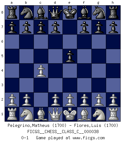 Last move : 0-1 2007 May 14 9:9:8 [Event "FICGS__CHESS__CLASS_C__000038"] [Site "FICGS"] [Date "2007.04.03"] [Round "1"] [White "Pelegrino,Matheus"] [Black "Flores,Luis"] [Result "0-1"] [WhiteElo "1700"] [BlackElo "1700"] 1.c4 e5 0-1 This chess game has been lost on time (started : 2007.04.03 12:49:28) English Opening Player Black won this chess game. Follow this game move after move (download)A passed Pawn increases in strength as the number of pieces on the board diminishes. (Capablanca) Kasparov ist eine Art Monster mit hundert Augen, denen auch nicht das Geringste entgeht. (Tony Miles) El poder defensivo de una pieza clavada, solamente es imaginario. (Aaron Nimzovich) Aucun coup ne doit être joué sans but. (Pedro Damiano) When you stop learning you start dying. (M. Scott Adams)