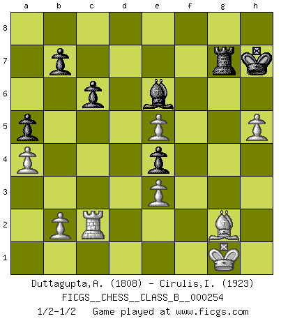 Last move : 1/2-1/2 2017 September 9 20:47:32 [Event "FICGS__CHESS__CLASS_B__000254"] [Site "FICGS"] [Date "2017.01.14"] [Round "1"] [White "Duttagupta,Aniruddha"] [Black "Cirulis,Ilmars"] [Result "1/2-1/2"] [WhiteElo "1808"] [BlackElo "1923"] 1.Nf3 e6 2.d4 d5 3.c4 Nf6 4.Nc3 Nbd7 5.cxd5 exd5 6.Bg5 c6 7.e3 Be7 8.Qc2 O-O 9.Bd3 Re8 10.h3 Ne4 11.Bf4 Ndf6 12.O-O Bd6 13.Ne5 Qe7 14.Rfe1 g6 15.a4 a5 16.g4 Kg7 17.Rac1 Bb8 18.Ne2 Nd7 19.Bxe4 Nxe5 20.Bg2 Nd7 21.Qd2 Nf6 22.Bxb8 Rxb8 23.Nf4 h5 24.gxh5 g5 25.Ne2 Ne4 26.Qd1 Bd7 27.Ng3 f5 28.Nxe4 fxe4 29.f3 Kh8 30.Rc3 Rg8 31.Rf1 Rbf8 32.fxe4 g4 33.Rxf8 Rxf8 34.hxg4 dxe4 35.Qe1 Rg8 36.Qg3 Rxg4 37.Qf2 Rg7 38.Rc2 Bg4 39.Qf4 Kg8 40.Qb8+ Kh7 41.Qe5 Qxe5 42.dxe5 Be6 1/2-1/2 Reti Opening Kingside Castling by player Black (move 8) Kingside Castling by player White (move 12) This chess game ended in a draw. Follow this game move after move (download)Bobby just drops the pieces and they fall on the right squares. (Miguel Najdorf) Früher wurde jeder komplizierte Zug, jedes interessante Opfer mit großem Beifall und Enthusiasmus aufgenommen. Heute schaltet man einfach seinen Fritz an, und man kann sehen, was los ist, ob der Zug geht oder nicht. (Vladimir Kramnik) Bobby es el jugador de Ajedrez mas fino que este país jamás haya producido. Su memoria para las movidas, su brillantez en soñar combinaciones y su feróz determinación por la victoria son algo extraño. (John Collins) Les erreurs sont comme les malheurs, elles n'arrivent jamais seules. (Siegbert Tarrasch) To err is human, to shift the blame on someone else is tactical. (Mladen Jankovic)