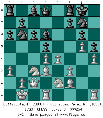 Last move : 0-1 2017 April 27 7:16:33 [Event "FICGS__CHESS__CLASS_B__000254"] [Site "FICGS"] [Date "2017.01.14"] [Round "1"] [White "Duttagupta,Aniruddha"] [Black "Rodriguez Perez,Rene"] [Result "0-1"] [WhiteElo "1808"] [BlackElo "1829"] 1.d4 e6 2.c4 d5 3.Nc3 Nf6 4.cxd5 exd5 5.Bg5 Nbd7 6.e3 Be7 7.Bd3 c6 8.Qc2 Nf8 9.Nge2 Ne6 10.Bh4 g6 11.a3 Ng7 12.f3 Nf5 13.Bf2 Ng7 14.g4 h5 15.g5 Nd7 16.h4 O-O 17.e4 Nb6 18.O-O-O a6 19.Kb1 Bd6 0-1 Queen's pawn Kingside Castling by player Black (move 16) Queenside Castling by player White (move 18) Player Black won this chess game. Follow this game move after move (download)Avoid the crowd. Do your own thinking independently. Be the Chess player, not the Chess piece. (Ralph Charell) Der 70jährige Viktor Kortschnoi: Die Rentenanstalt wollte mich zwingen in Rente zu gehen. Meine Frau erhält jetzt eine Pension- und ich zahle weiter in die Rentenkasse ein! (Viktor Kortschnoi) Tu sabes que vas a perder. Aún cuando tenía la ventaja, yo sabía que iba a perder. - al estar jugando con Fischer (Andrew Soltis) Le plus grand jeu de l'esprit jamais inventé, plus vous l'apprenez, plus vous y prenez du plaisir. (Garry Kasparov) Shallow men believe in luck. Strong men belive in cause and effect. (Ralph Waldo Emerson)