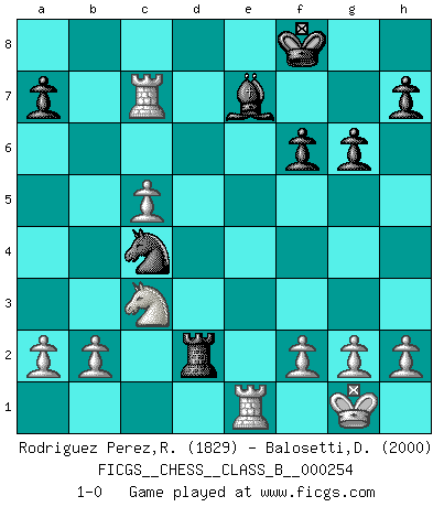 Last move : 1-0 2017 June 2 19:54:18 [Event "FICGS__CHESS__CLASS_B__000254"] [Site "FICGS"] [Date "2017.01.14"] [Round "1"] [White "Rodriguez Perez,Rene"] [Black "Balosetti,Davide"] [Result "1-0"] [WhiteElo "1829"] [BlackElo "2000"] 1.e4 c5 2.Nf3 Nc6 3.Bb5 d6 4.O-O Bd7 5.Re1 e6 6.Bxc6 Bxc6 7.d4 cxd4 8.Nxd4 Nf6 9.Qf3 Be7 10.Nxc6 bxc6 11.e5 Nd5 12.Qg3 O-O 13.Bh6 g6 14.c4 Nb6 15.exd6 Bxd6 16.Qc3 f6 17.Bxf8 Kxf8 18.Qh3 Qd7 19.Qxe6 Qxe6 20.Rxe6 Be7 21.Rxc6 Rd8 22.Nc3 Rd2 23.c5 Nc4 24.Rc8+ Kf7 25.Rc7 Kf8 26.Re1 1-0 Sicilian : Nimzovich-Rossolimo attack (without ...d6) Kingside Castling by player White (move 4) Kingside Castling by player Black (move 12) Player White won this chess game. Follow this game move after move (download)I feel as if I were a piece in a game of Chess, when my opponent says of it: That piece cannot be moved. (Soren Kierkegaard) Wenn du auf das Glück wartest, wird das Leben ziemlich langweilig. (Mikhail Nekhemyevich Tal) Juega la Apertura como un libro, el Juego Medio como un mago y los Finales como una máquina. (Spielmann) Toute estimation doit être constamment réévaluée. (Jacob Estrin) The age of a woman doesn't mean a thing. The best tunes are played on the oldest fiddles. (Ralph Waldo Emerson)