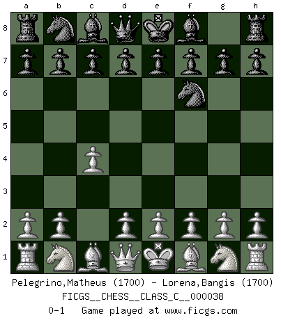 Last move : 0-1 2007 May 15 21:15:49 [Event "FICGS__CHESS__CLASS_C__000038"] [Site "FICGS"] [Date "2007.04.03"] [Round "1"] [White "Pelegrino,Matheus"] [Black "Lorena,Bangis"] [Result "0-1"] [WhiteElo "1700"] [BlackElo "1700"] 1.c4 Nf6 0-1 This chess game has been lost on time (started : 2007.04.03 12:49:28) English, 1...Nf6 (Anglo-Indian defense) Player Black won this chess game. Follow this game move after move (download)After a bad opening, there is hope for the middle game. After a bad middle game, there is hope for the endgame. But once you are in the endgame, the moment of truth has arrived. (Edmar Mednis) Die westlichen Werte sind eine Sprache, welche die Putin-Administration nicht versteht. (Garry Kasparov) Sin errores no puede haber brillantez. (Emanuel Lasker) Mais n'est-ce pas déjà le limiter injurieusement que d'appeler les échecs un jeu? N'est-ce pas aussi une science, un art, ou quelque chose qui, comme le cercueil de Mahomet entre ciel et terre, est suspendu entre l'un et l'autre, et qui réunit un nombre incroyable de contraires ? (Stefan Zweig) Treat your password like your toothbrush. Don't let anybody else use it, and get a new one every six months. (Clifford Stoll)