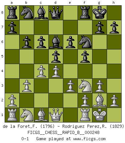 Last move : 0-1 2017 February 27 5:35:26 [Event "FICGS__CHESS__RAPID_B__000248"] [Site "FICGS"] [Date "2017.01.15"] [Round "1"] [White "de la Foret,Fred"] [Black "Rodriguez Perez,Rene"] [Result "0-1"] [WhiteElo "1796"] [BlackElo "1829"] 1.d4 d5 2.c4 e6 3.e3 c6 4.Nf3 f5 5.g3 Nf6 6.Bg2 Bd6 7.O-O O-O 8.b3 b6 0-1 This chess game has been lost on time (started : 2017.01.15 14:24:35) Queen's gambit declined Kingside Castling by player White (move 7) Kingside Castling by player Black (move 7) Player Black won this chess game. Follow this game move after move (download)The chessboard is the world, the pieces are the phenomena of the Universe, the rules of the game are what we call the laws of Nature and the player on the other side is hidden from us. (Thomas Huxley) Schach ist gnadenlos. Du mußt bereit sein zu töten. (Nigel Short) La captura del Rey enemigo es la finalidad pero no el primer objetivo de la partida. (William Steinitz) Le jeu d'échecs est comme rejeté hors du temps. (Antoine de Saint-Exupéry) A mistake is only a mistake if you let it happen twice. Otherwise it is a learning experience. (Daniel Parmet)