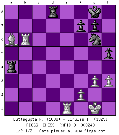 Last move : 1/2-1/2 2017 April 25 18:18:6 [Event "FICGS__CHESS__RAPID_B__000248"] [Site "FICGS"] [Date "2017.01.15"] [Round "1"] [White "Duttagupta,Aniruddha"] [Black "Cirulis,Ilmars"] [Result "1/2-1/2"] [WhiteElo "1808"] [BlackElo "1923"] 1.e4 e6 2.d3 a6 3.Nf3 c5 4.c4 Nc6 5.Be2 Nf6 6.Nc3 Bd6 7.Be3 O-O 8.d4 cxd4 9.Bxd4 Bb8 10.Be3 Ng4 11.Bc5 d6 12.Ba3 Qc7 13.h3 Nf6 14.Qd2 Rd8 15.Rd1 b6 16.Qc2 Bb7 17.O-O Rd7 18.b3 Ba7 19.Rd2 Rad8 20.Bb2 Rb8 21.Rc1 Ne7 22.Bf1 Ng6 23.a4 Rbd8 24.Re1 Bb8 25.g3 d5 26.exd5 exd5 27.Nxd5 Nxd5 28.cxd5 Qxc2 29.Rxc2 Bxd5 30.Nd4 Be5 31.Bxa6 Bxd4 32.Bxd4 Bxb3 33.Rc3 Rxd4 34.Rxb3 Rxa4 35.Rxb6 h5 1/2-1/2 French : King's Indian attack Kingside Castling by player Black (move 7) Kingside Castling by player White (move 17) This chess game ended in a draw. Follow this game move after move (download)For me, Chess is life and every game is like a new life. Every Chess player gets to live many lives in one lifetime. (Eduard Gufeld) Das Schachspiel ist ein See, in welchem eine Mücke baden und ein Elefant ertrinken kann. (Emanuel Lasker) El Ajedrez es un juego terrible. Si no dominas el centro, tu oponente tiene una posición mas libre. Si tu tienes el centro, entonces realmente tienes algo de que preocuparte. (Siegbert Tarrasch) Demandez au pauvre Cg1 ce qu'il en pense. Eduard Gufeld à propos de la variante Saemisch de l'Est-Indienne. Life is painting a picture, not doing a sum. (Oliver Wendell Holmes, Jr.)