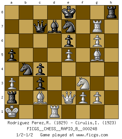 Last move : 1/2-1/2 2017 March 15 16:55:30 [Event "FICGS__CHESS__RAPID_B__000248"] [Site "FICGS"] [Date "2017.01.15"] [Round "1"] [White "Rodriguez Perez,Rene"] [Black "Cirulis,Ilmars"] [Result "1/2-1/2"] [WhiteElo "1829"] [BlackElo "1923"] 1.e4 e6 2.d4 d5 3.e5 c5 4.c3 Nc6 5.Nf3 Qb6 6.a3 f6 7.Bd3 fxe5 8.dxe5 c4 9.Bc2 g6 10.Qe2 Bg7 11.Be3 Qc7 12.Nbd2 Bd7 13.O-O-O Nge7 14.Kb1 a5 15.h4 b5 16.h5 b4 17.hxg6 bxc3 18.Nxc4 dxc4 19.Rxh7 Rb8 20.Rxg7 Rxb2+ 21.Ka1 Nb4 22.Bg5 Ra2+ 1/2-1/2 French : Advance, Paulsen attack Queenside Castling by player White (move 13) This chess game ended in a draw. Follow this game move after move (download)The combination player thinks forward; he starts from the given position, and tries the forceful moves in his mind. (Emanuel Lasker) Wenn du gegen Bobby spielst, ist es keine Frage von gewinnen oder verlieren. Es ist eine Frage des Überlebens. (Boris Vassilievich Spassky) Yo adoro todas la posiciones. Denme una partida posicional difícil, y la jugaré. Pero posiciones totalmente ganadas, no las tolero. (Hein Donner) La guerre est enfant de la passion, la passion est enfant du narcissisme et le narcissisme est l'enfant. (...) Une autre partie ? (Thibault de Vassal) It's unlucky to be superstitious. (Dave Enteles)