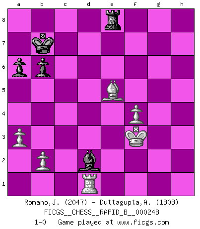 Last move : 1-0 2017 July 6 11:11:38 [Event "FICGS__CHESS__RAPID_B__000248"] [Site "FICGS"] [Date "2017.01.15"] [Round "1"] [White "Romano,Jacopo"] [Black "Duttagupta,Aniruddha"] [Result "1-0"] [WhiteElo "2047"] [BlackElo "1808"] 1.e4 d5 2.exd5 Qxd5 3.Nc3 Qa5 4.d4 Nf6 5.Nf3 c6 6.Bc4 Bf5 7.Bd2 e6 8.Nd5 Qd8 9.Nxf6+ gxf6 10.Bb3 Nd7 11.Qe2 Qc7 12.Nh4 Bg6 13.O-O-O O-O-O 14.g3 Nb6 15.Ba5 Bg7 16.f4 Rde8 17.Qf2 f5 18.c4 Qd7 19.Nf3 Bh5 20.Rd3 Bxf3 21.Qxf3 Kb8 22.Rhd1 h5 23.h4 Qc8 24.Bb4 Nd7 25.Bd6+ Ka8 26.Kb1 a6 27.Bb4 Nf6 28.d5 exd5 29.cxd5 Nxd5 30.Bxd5 cxd5 31.Rxd5 Qc6 32.Qd3 Rc8 33.a3 Rc7 34.Ba5 R7c8 35.Rd6 Qe4 36.Qxe4 fxe4 37.Rd7 Bf8 38.Rxf7 Bc5 39.Rf5 b6 40.Bc3 Rh7 41.R1d5 Bf2 42.Rg5 e3 43.Rde5 R7h8 44.Kc2 Rhg8 45.Rxg8 Rxg8 46.Kd3 Bxg3 47.Rg5 Rd8+ 48.Kxe3 Bxh4 49.Rxh5 Re8+ 50.Kd3 Be1 51.Be5 Bg3 52.Ke4 Kb7 53.Kf3 Be1 54.Rh1 Bd2 55.Rd1 1-0 This chess game has been lost on time (started : 2017.01.15 14:24:35) Scandinavian (centre counter) defense Queenside Castling by player White (move 13) Queenside Castling by player Black (move 13) Player White won this chess game. Follow this game move after move (download)Modern Chess is too much concerned with things like Pawn structure. Forget it, Checkmate ends the game. (Nigel Short) Stil? Ich habe keinen Stil! (Anatoly Karpov) Coloca el contenido de las piezas del Ajedrez en un sombrero, agitalo vigorosamente, arrojalas en un tablero desde una altura de 30 centimetros y así obtendras el estilo de Steinitz. (H. E. Bird) Donnez-moi un Cavalier en 6e et je gagnerais toutes mes parties. (Steinitz) Never risk one's whole fortune unless supported by one's entire army. (Niccolo Machiavelli)