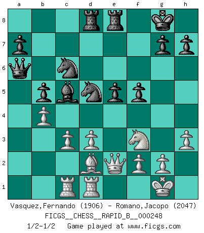 Last move : 1/2-1/2 2017 April 14 12:48:59 [Event "FICGS__CHESS__RAPID_B__000248"] [Site "FICGS"] [Date "2017.01.15"] [Round "1"] [White "Vasquez,Fernando"] [Black "Romano,Jacopo"] [Result "1/2-1/2"] [WhiteElo "1906"] [BlackElo "2047"] 1.e4 c5 2.Nf3 d6 3.Bb5+ Bd7 4.Bxd7+ Nxd7 5.O-O Ngf6 6.d3 e6 7.Qe2 Be7 8.Ng5 O-O 9.Nf3 Re8 10.h3 Nb8 11.Bf4 d5 12.Nbd2 Qb6 13.Rab1 Nc6 14.a3 Qa6 15.c3 Rad8 16.Rfd1 dxe4 17.Nxe4 Nd5 18.Bd2 b5 19.b4 cxb4 20.axb4 e5 21.Rbc1 f5 22.Nc5 Bxc5 1/2-1/2 Sicilian : Canal-Sokolsky attack, 3...Bd7 Kingside Castling by player White (move 5) Kingside Castling by player Black (move 8) This chess game ended in a draw. Follow this game move after move (download)The most important feature of the Chess position is the activity of the pieces. This is absolutely fundamental in all phases of the game: Opening, Middlegame and especially Endgame. The primary constraint on a piece's activity is the Pawn structure. (Michael Stean) Intelligenz läßt sich nicht am Weg, sondern nur am Ergebnis feststellen. (Garry Kasparov) Nada excita más a Grandes Maestros aburridos que una novedad teórica. (Dominic Lawson) Il vaut toujours mieux jouer un plan faux de façon logique que de n'avoir pas de plan du tout. (Victor Kortchnoï) Creativity is inventing, experimenting, growing, taking risks, breaking rules, making mistakes, and having fun. (Mary Lou Cook)