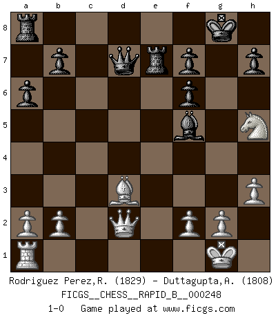 Last move : 1-0 2017 April 17 5:51:14 [Event "FICGS__CHESS__RAPID_B__000248"] [Site "FICGS"] [Date "2017.01.15"] [Round "1"] [White "Rodriguez Perez,Rene"] [Black "Duttagupta,Aniruddha"] [Result "1-0"] [WhiteElo "1829"] [BlackElo "1808"] 1.e4 e6 2.d4 d5 3.Bd3 c5 4.Nf3 a6 5.exd5 exd5 6.c4 cxd4 7.O-O Nf6 8.cxd5 Qxd5 9.Nxd4 Nc6 10.Re1+ Be7 11.Be3 Nxd4 12.Bxd4 Be6 13.Nc3 Qd7 14.Ne2 Bb4 15.Rf1 Be7 16.Nf4 Bg4 17.Qd2 O-O 18.Rfe1 Rfd8 19.Bc3 Re8 20.h3 Bf5 21.Rxe7 Rxe7 22.Bxf6 gxf6 23.Nh5 1-0 French : Schlechter variation Kingside Castling by player White (move 7) Kingside Castling by player Black (move 17) Player White won this chess game. Follow this game move after move (download)Chess is everything: art, science and sport. (Anatoly Karpov) Ich liebe den Moment, wenn ich das Ego meines Gegenüber breche. (Robert James Fischer) El Ajedrez es de 30 a 40 por ciento psicología. Uno no cuenta con esto cuando se juega contra una computadora. No lo puedo confundir. (Judith Polgar) Les échecs, c'est l'imagination. (David Bronstein) Vladimir Ras-Putin is still alive... He is also a good actor, I saw him in the Lord of the Rings. (Rodolfo d'Ettorre)