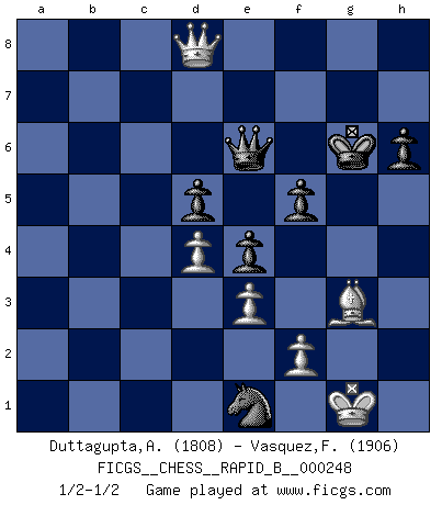 Last move : 1/2-1/2 2017 June 8 7:27:39 [Event "FICGS__CHESS__RAPID_B__000248"] [Site "FICGS"] [Date "2017.01.15"] [Round "1"] [White "Duttagupta,Aniruddha"] [Black "Vasquez,Fernando"] [Result "1/2-1/2"] [WhiteElo "1808"] [BlackElo "1906"] 1.c4 e5 2.g3 Nf6 3.Bg2 d5 4.cxd5 Nxd5 5.Nf3 Nc6 6.Nc3 Nb6 7.O-O Be7 8.a3 O-O 9.b4 Be6 10.Rb1 f6 11.d3 a5 12.b5 Nd4 13.Nd2 Qc8 14.e3 Nf5 15.Qc2 a4 16.Bb2 Ra5 17.Rfc1 Nd6 18.Nce4 Rxb5 19.Nxd6 cxd6 20.Bc3 Qd7 21.Rxb5 Qxb5 22.Bxb7 Qd7 23.Bg2 d5 24.Qb2 Rb8 25.d4 e4 26.Bf1 Kf7 27.Rb1 Qc6 28.Bb5 Qa8 29.Kg2 g6 30.Qa2 Nc8 31.Qc2 Bxa3 32.Be8+ Kxe8 33.Rxb8 Qxb8 34.Qxa4+ Kf7 35.Qxa3 g5 36.Qc5 Qb7 37.h4 gxh4 38.gxh4 Ne7 39.h5 Qc8 40.Bb4 Nf5 41.Nb3 Qg8+ 42.Kf1 Kg7 43.Nc1 Kh6 44.Ne2 Ng7 45.Nf4 Nxh5 46.Qf8+ Kg5 47.Nxe6+ Qxe6 48.Qb8 Kg6 49.Bf8 Qa6+ 50.Kg1 Qc6 51.Qh2 f5 52.Bd6 h6 53.Qe5 Nf6 54.Bf8 Ng4 55.Qb8 Qe6 56.Bd6 Nf6 57.Be5 Nh7 58.Bc7 Ng5 59.Bf4 Nf3+ 60.Kg2 Nh4+ 61.Kh2 Nf3+ 62.Kg2 Kh5 63.Bg3 Qg6 64.Kh3 Ne1 65.Qd8 Qe6 66.Kh2 Kg6 67.Kg1 1/2-1/2 English Opening Kingside Castling by player White (move 7) Kingside Castling by player Black (move 8) This chess game ended in a draw. Follow this game move after move (download)The sign of a great Master is his ability to win a won game quickly and painlessly. (Irving Chernev) Modernes Schach erfordert enorme Anspannung. Es ist für einen normalen Menschen unmöglich das auszuhalten. (Viktor Kortschnoi) Tu sabes, camarada Pachman, no disfruto el ser un Ministro, preferería jugar al Ajedrez como tu. (Che Guevara) En blitz, le Cavalier l'emporte sur le Fou. (Vlastimil Hort) All the troubles of the world come from being unable to sit alone in a quiet room. (Blaise Pascal)