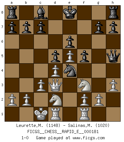 Last move : 1-0 2017 March 7 19:24:47 [Event "FICGS__CHESS__RAPID_E__000181"] [Site "FICGS"] [Date "2017.01.16"] [Round "1"] [White "Leurette,Marc-Antoine"] [Black "Salinas,Marcelo"] [Result "1-0"] [WhiteElo "1148"] [BlackElo "1020"] 1.e4 e6 2.d4 Qh4 3.Bd3 Bb4+ 4.Bd2 Nc6 5.Nf3 Qg4 6.h3 Qh5 7.Bxb4 Nxb4 8.c3 Nxd3+ 9.Qxd3 d5 10.e5 f5 11.Nbd2 Nf6 12.O-O-O Ne4 13.Rhf1 1-0 This chess game has been lost on time (started : 2017.01.16 18:29:24) French defense Queenside Castling by player White (move 12) Player White won this chess game. Follow this game move after move (download)Chess is a matter of delicate judgment, knowing when to punch and how to duck. (Bobby Fischer) Es war undenkbar für die Behörden, dass ein sowjetischer Großmeister auf diese Art und Weise [Fischer-Taimanov 6:0] verliert, ohne dass es eine politischer Erklärung dafür gäbe. (Mark Taimanov) Realmente no sabemos como el juego fue inventado, aunque hay sospechas. Tan pronto como descubramos a los culpables, se los haremos saber. (Bruce Pandolfini) Le jeu d'échecs fait naître et fortifie en nous plusieurs qualités précieuses dans le cours de l'existence, telles que la prévoyance, la circonspection, la prudence, et la persévérance. (Benjamin Franklin - 1783, la morale des échecs) What doesn't kill us makes us stronger. (Friedrich Nietzsche)
