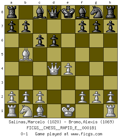 Last move : 0-1 2017 March 26 9:56:45 [Event "FICGS__CHESS__RAPID_E__000181"] [Site "FICGS"] [Date "2017.01.16"] [Round "1"] [White "Salinas,Marcelo"] [Black "Bromo,Alexis"] [Result "0-1"] [WhiteElo "1020"] [BlackElo "1069"] 1.e4 e5 2.Nf3 Nc6 3.d4 exd4 4.Nxd4 Nxd4 5.Qxd4 d6 6.Bb5+ c6 0-1 This chess game has been lost on time (started : 2017.01.16 18:29:24) Scotch game Player Black won this chess game. Follow this game move after move (download)Chess is everything: art, science and sport. (Anatoly Karpov) Im Leben werden Partien nie so unstrittig gewonnen wie im Spiel (Emanuel Lasker) Te sientas frente a un tablero y repentinamente tu corazón brinca. Tu mano tiembla al tomar una pieza y moverla. Pero lo que el Ajedrez te enseña es que tu debes permanecer ahí con calma y pensar de que si realmente es una buena idea o de que si hay otras ideas mejores. (Stanley Kubrick) L'action d'une oeuvre littéraire se déroule sur un champ de bataille. Les masques et les types du drame moderne correspondent aux pièces du jeu d'échecs. L'intrigue correspond aux coups et aux gambits, c'est à dire aux techniques du jeu telles qu'utilisées et interprétées par les joueurs. Les tactiques et les péripéties [mouvements] correspondent aux coups exécutés par l'adversaire. (Viktor Shklovsky) A good aphorism is too hard for the tooth of time, and is not worn away with the centuries, although it serves as food for every speech. (Friedrich Nietzsche)
