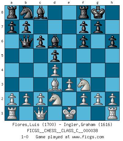 Last move : 1-0 2007 June 15 7:37:8 [Event "FICGS__CHESS__CLASS_C__000038"] [Site "FICGS"] [Date "2007.04.03"] [Round "1"] [White "Flores,Luis"] [Black "Ingler,Graham"] [Result "1-0"] [WhiteElo "1700"] [BlackElo "1616"] 1.d4 d5 2.Bg5 h6 3.Bh4 c6 4.e3 Qb6 5.Qc1 Nf6 6.Bxf6 exf6 7.Nd2 Bd6 8.Ngf3 O-O 9.Bd3 1-0 This chess game has been lost on time (started : 2007.04.03 12:49:28) Levitsky attack (Queen's Bishop attack) Kingside Castling by player Black (move 8) Player White won this chess game. Follow this game move after move (download)Chess is played with the mind and not with the hands ! (Renaud and Kahn) Spielt Blackmar-Diemer-Gambit, und das Matt kommt von selbst! (Emil Joseph Diemer) No solamente yo pronostico su triunfo sobre Botvinnik, sino que me adelanto y digo que probablemente Fischer es el jugador de Ajedrez mas grande que haya existido. (John Collins) Les écrivains ont utilisé les échecs pour analyser les côtés extrêmes de la nature humaine. Dans ce cadre, les échecs offrent un champ d'expérimentation idéal. Mais on pourrait faire la même chose avec la peinture. Et là, en vous référant à Van Gogh, vous ne tirerez pas de conclusion définitive sur les peintres. (Gary Kasparov) I believe in luck. How else can you explain the success of those you dislike ? (Jean Cocteau)