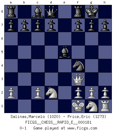 Last move : 0-1 2017 March 2 18:27:18 [Event "FICGS__CHESS__RAPID_E__000181"] [Site "FICGS"] [Date "2017.01.16"] [Round "1"] [White "Salinas,Marcelo"] [Black "Price,Eric"] [Result "0-1"] [WhiteElo "1020"] [BlackElo "1273"] 1.e4 e5 2.d4 exd4 3.Qxd4 Nc6 4.Qd5 Nf6 5.Bg5 Be7 6.Bxf6 Bxf6 7.Bc4 O-O 8.Qh5 Bxb2 9.e5 Nxe5 10.Nd2 Bxa1 11.Bd3 Nxd3+ 12.Kf1 Nf4 13.Qf3 Be5 0-1 This chess game has been lost on time (started : 2017.01.16 18:29:24) Centre game Kingside Castling by player Black (move 7) Player Black won this chess game. Follow this game move after move (download)I give 98 percent of my mental energy to Chess. Others give only 2 percent. (Bobby Fischer) Schach ist Leben. (Robert James Fischer) La pasion por jugar al Ajedrez es una de las mas inexplicables en el mundo. (H.G. Wells) On peut tirer plus d'utilité d'une partie perdue que de 100 parties gagnées. (Capablanca) Hello Thibault, if I have had a plan (and I had one, I hope), I have forgotten it during the last week... - Hello Heinz-Georg. What do you mean a plan ? (Anonymous players, during a Big Chess game)